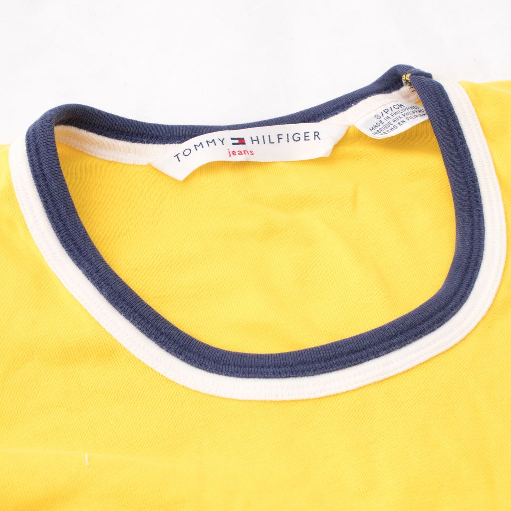 Vintage yellow Tommy top with yellow and navy lining along neck and sleeve openings, like new.