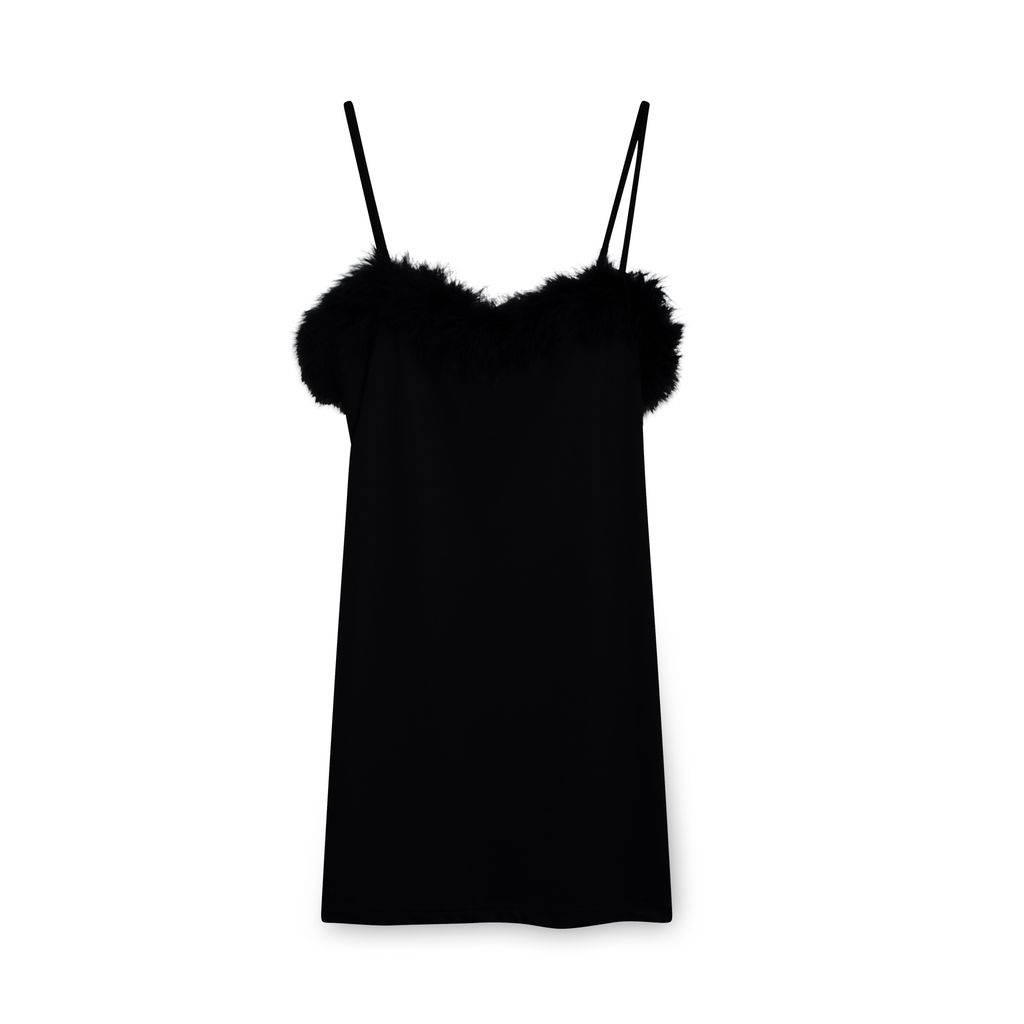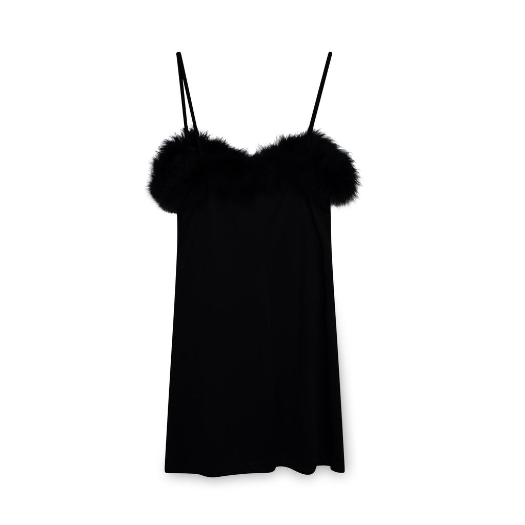 Vintage faux fur trimmed slip dress features trim at neckline, and spaghetti straps.