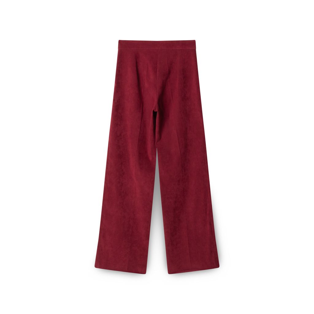 Vintage two-piece maroon suit features button closures with contrast stitching and wrap tie at waist.