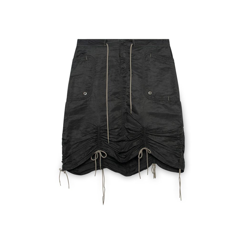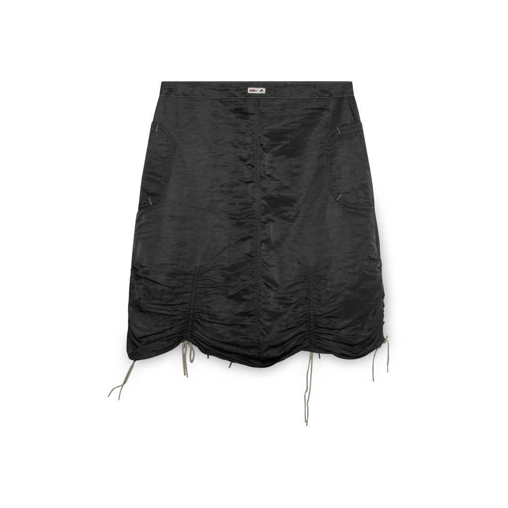Vintage Union Bay parachute skirt features adjustable drawstring details throughout, two pockets, drawstring at waistband, and zipper/hook & eye closure at front.
