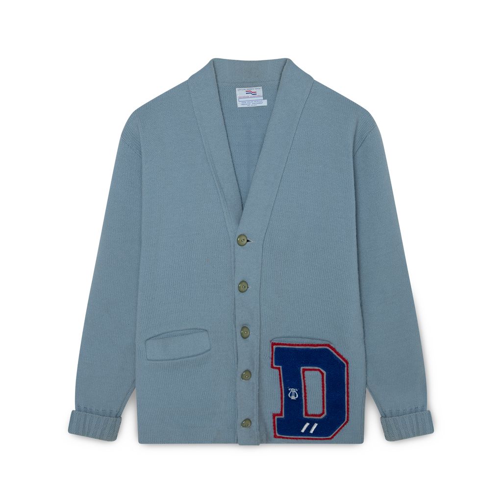 Vintage Varsity Letter Cardigan features varsity letter patch on front, 2 pockets, and ribbed cuffs.