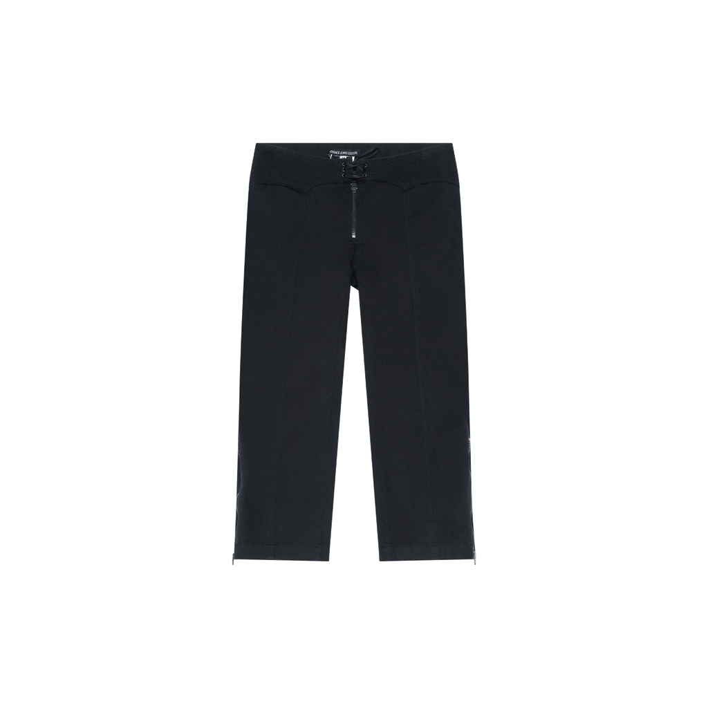 Vintage Versace Jeans Capris features low waist, front zip and lace up closure, and zippers at leg opening.