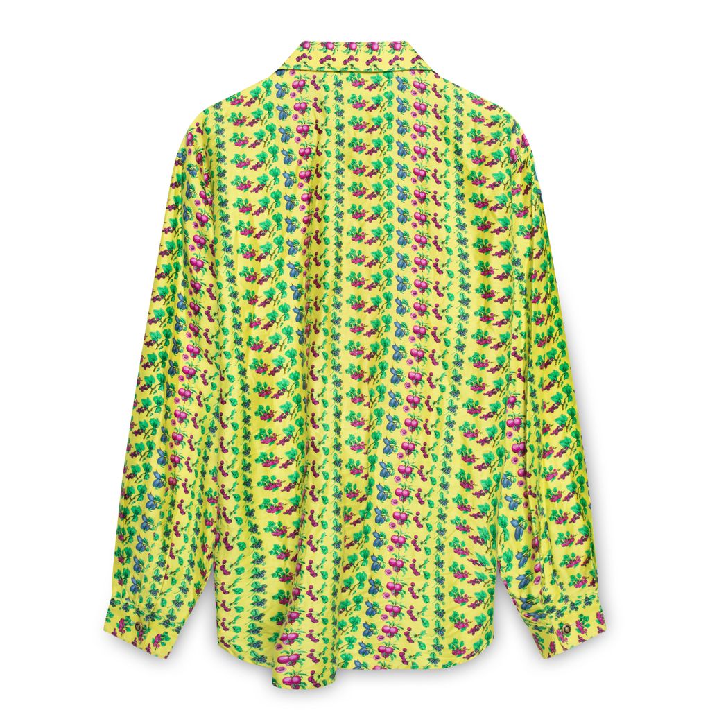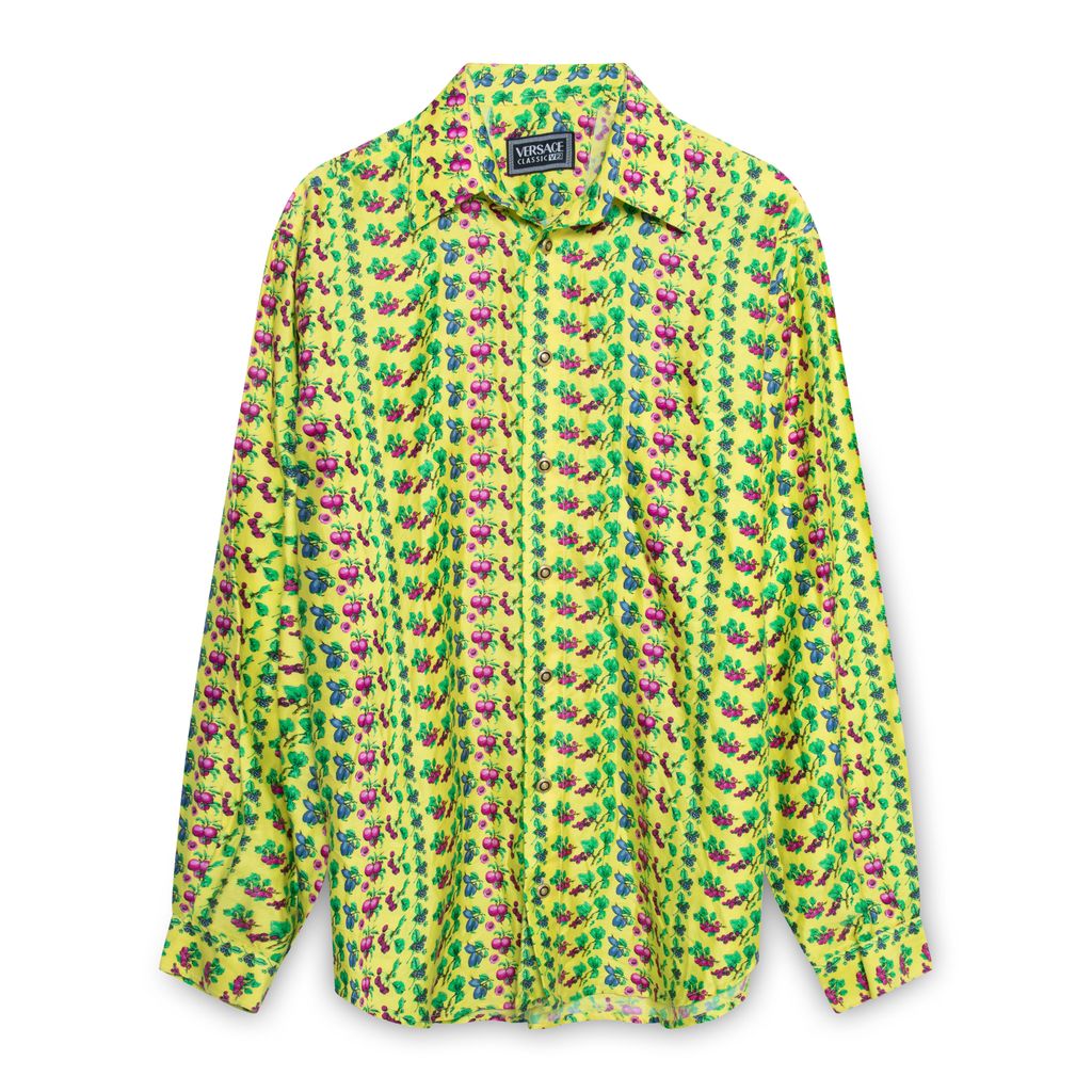 Vintage Versace Classic V2 printed button up shirt features colorful pattern throughout, single pocket at chest, center gold metal button front closure.