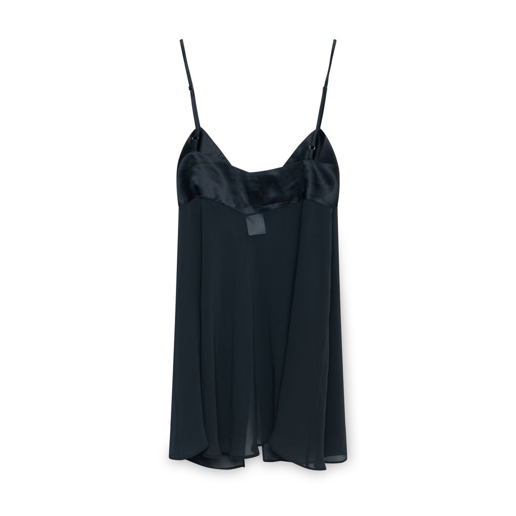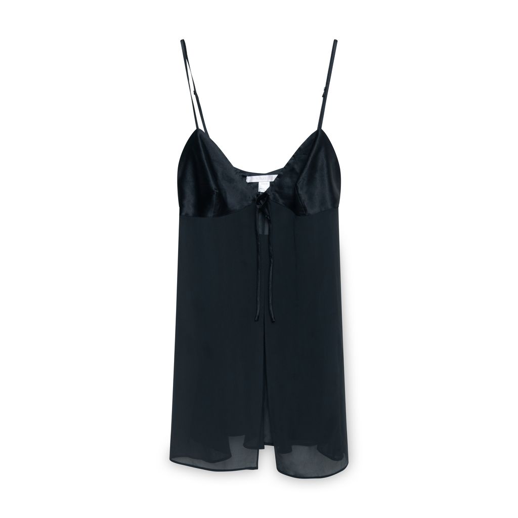 Vintage Victoria's Secret Black Slip Top features sheer body, front tie closure, satin bust, and adjustable shoulder straps.