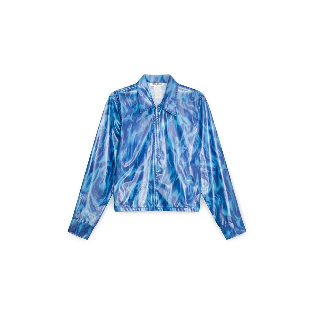 Vintage Vinyl Zip-Up Jacket features blue and teal patter throughout, zip-up closure, adjustable cuffs.
