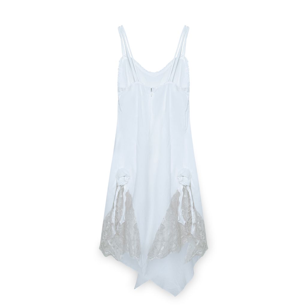 Vintage White Asymmetric Hem Dress features lace and rose detailing on sides, triple spaghetti straps, asymmetric hem, and back zip.