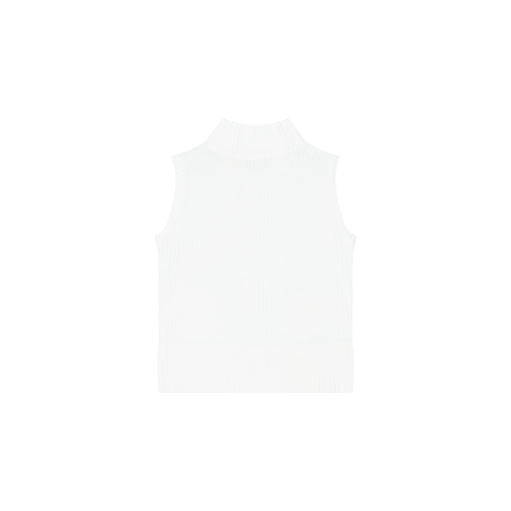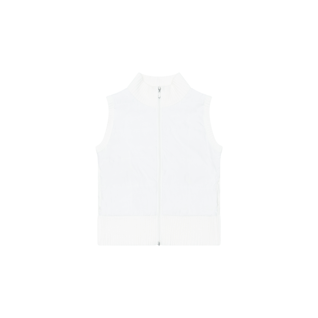 Vintage White Knit Vest Puffer features knit back, collar, and trims, front zip closure, 2 pockets, and puffer material on front.
