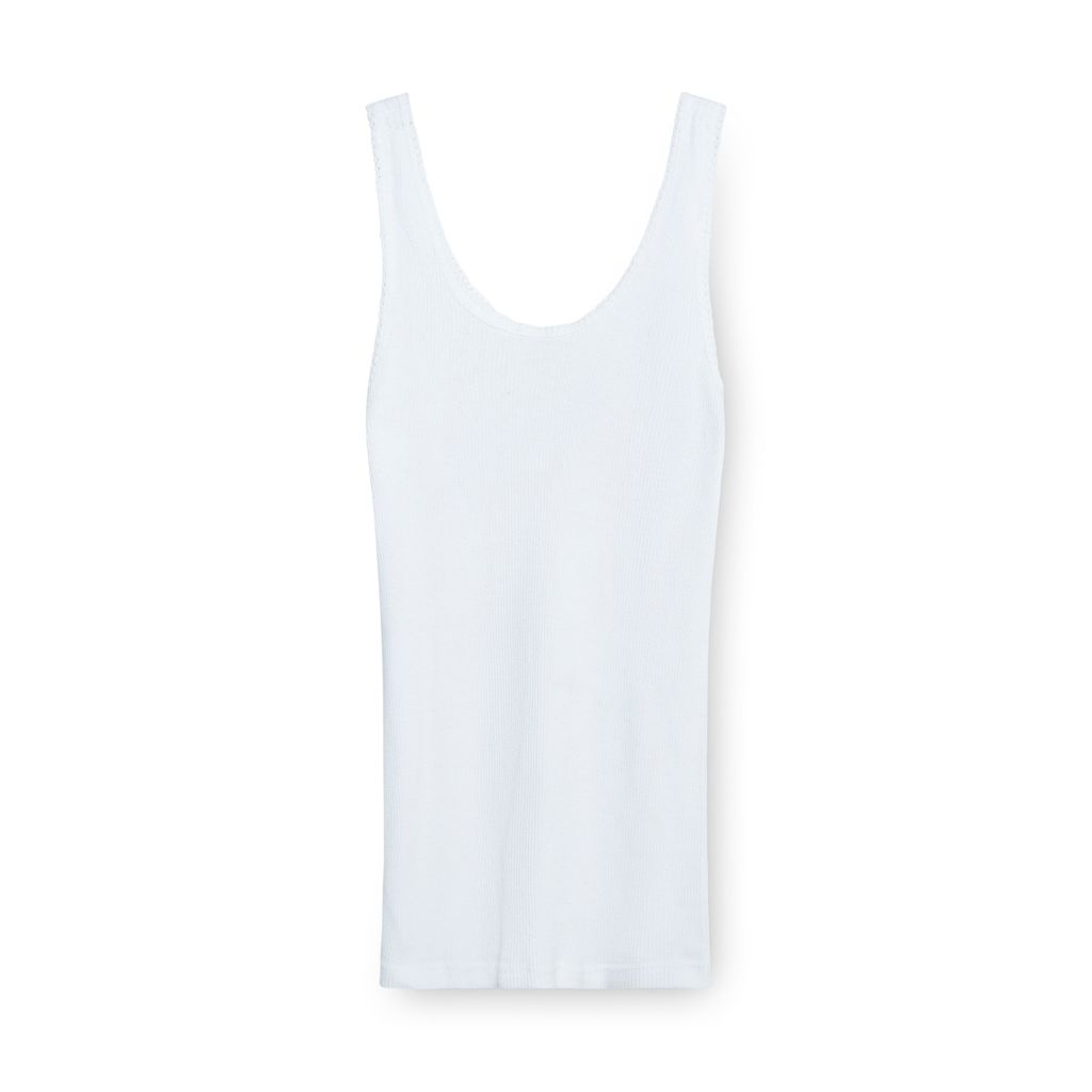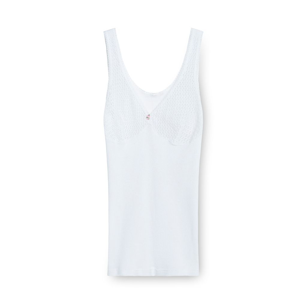 Vintage White Knit Tank features embroidered rose detailing at chest, contrast patterned knit at bust, and full length.