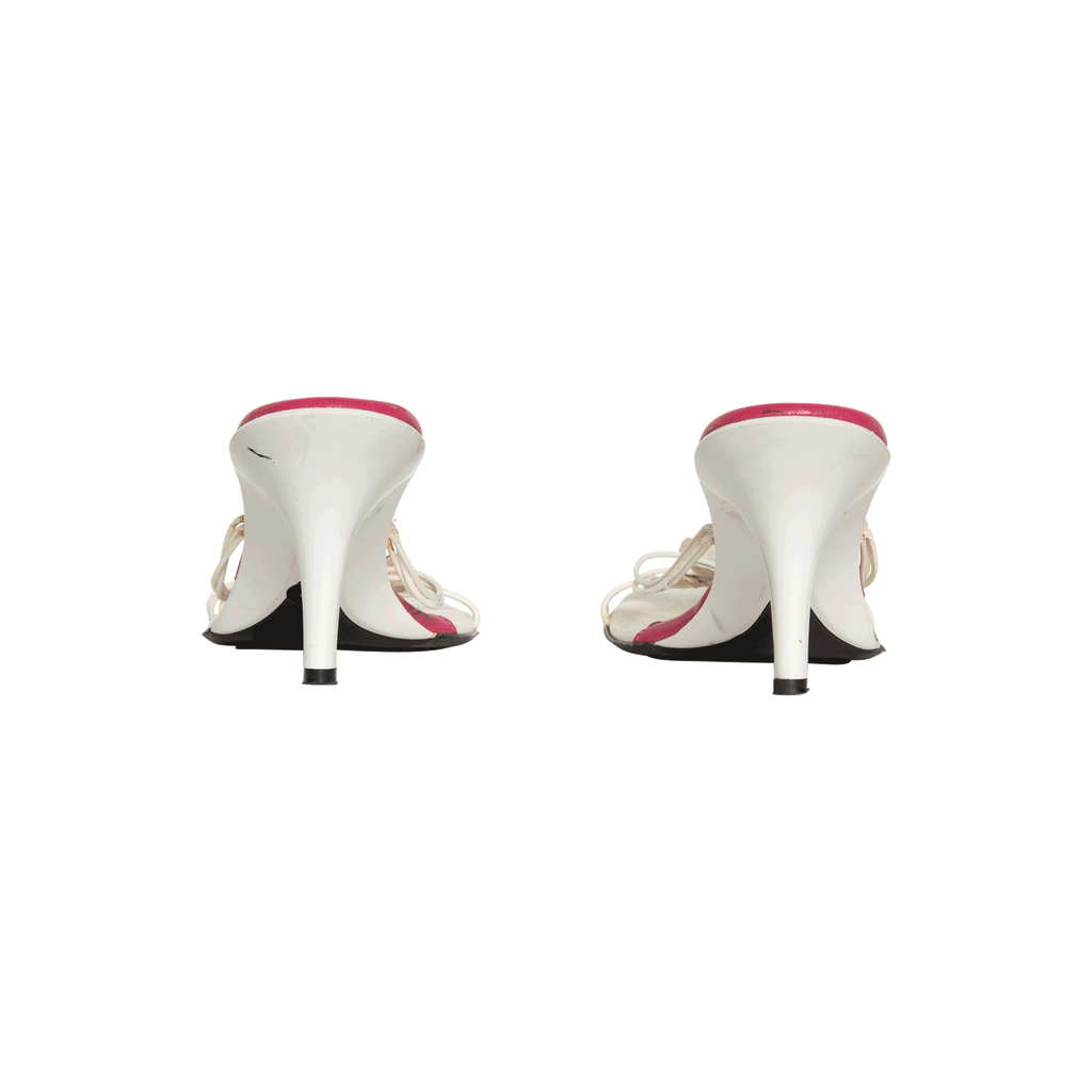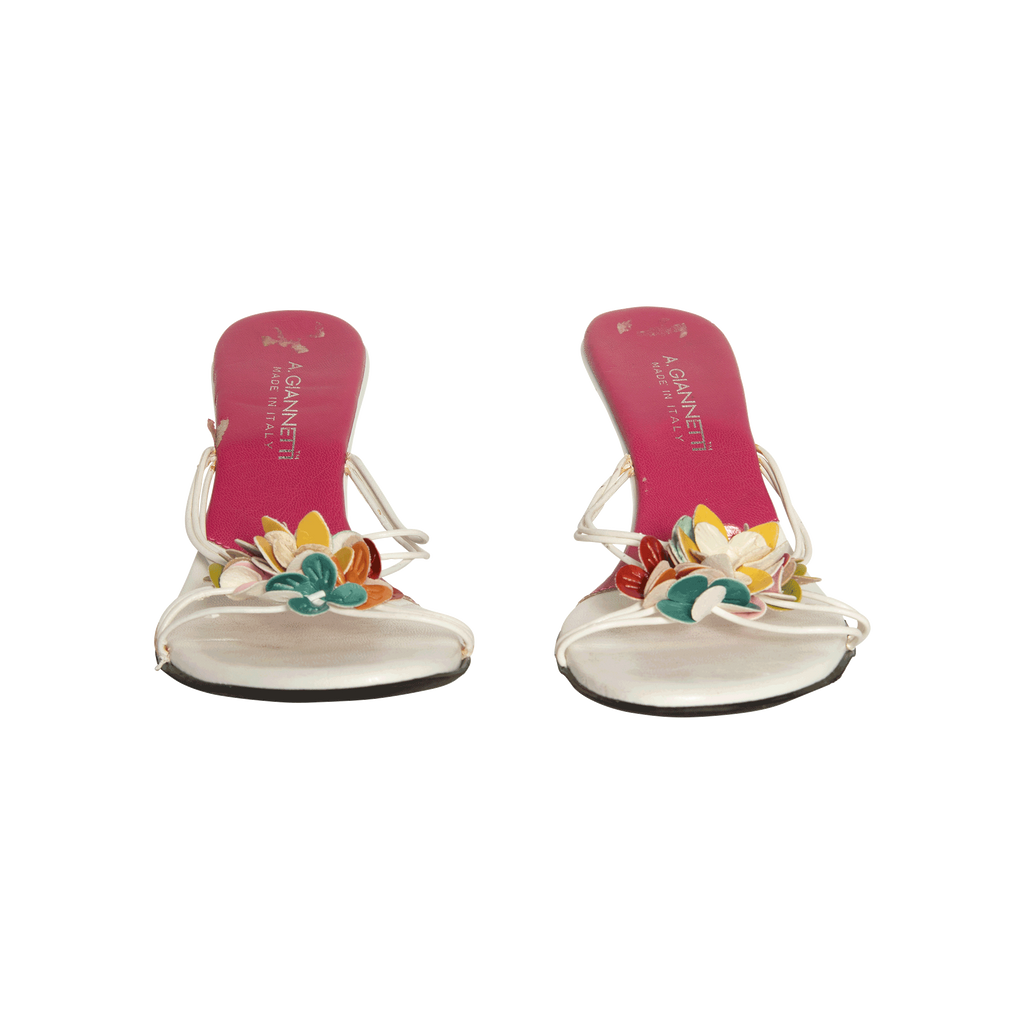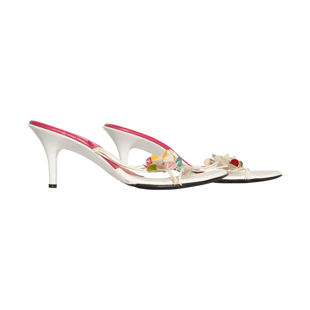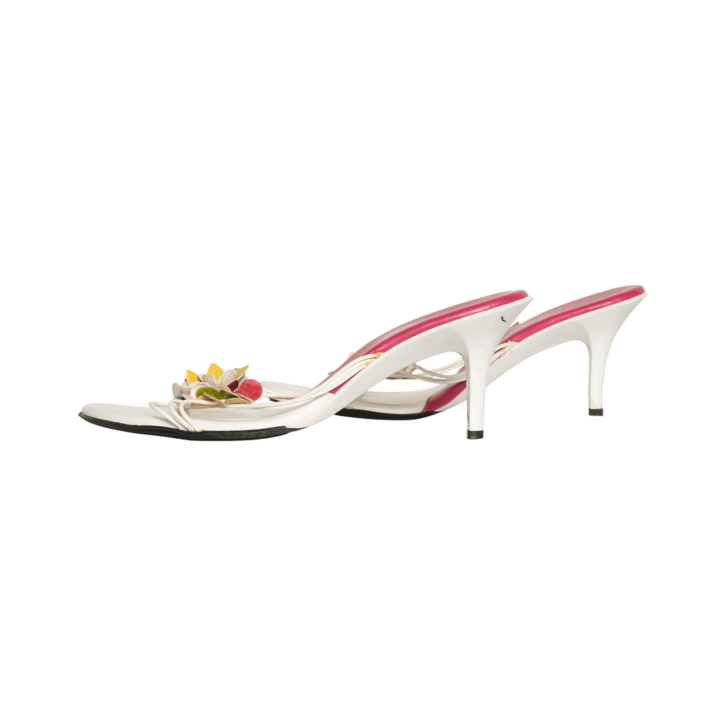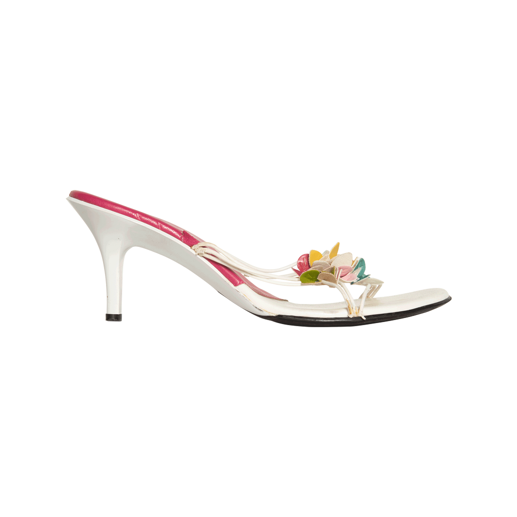 Vintage White Leather Floral Heels features tiny straps with floral appliqué and 2 inch heel.