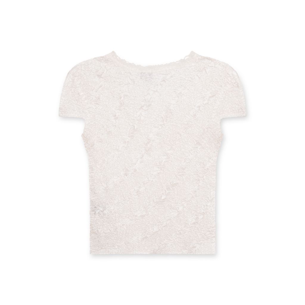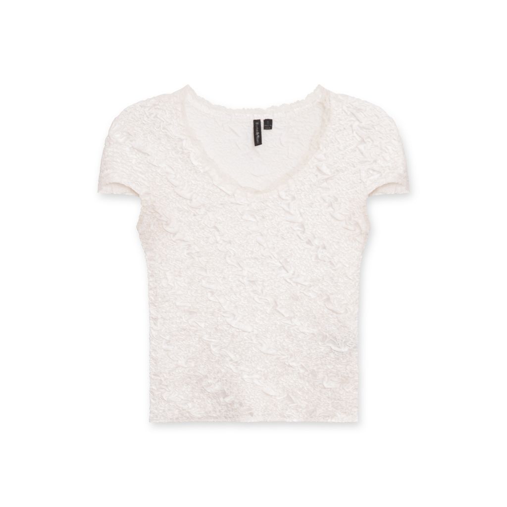 Vintage Pearl Pleated Top features pleated texture, lace trim around neck, cap sleeve.