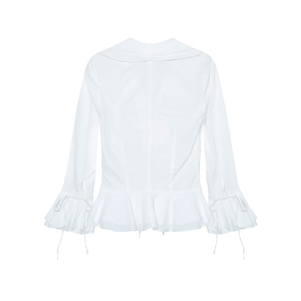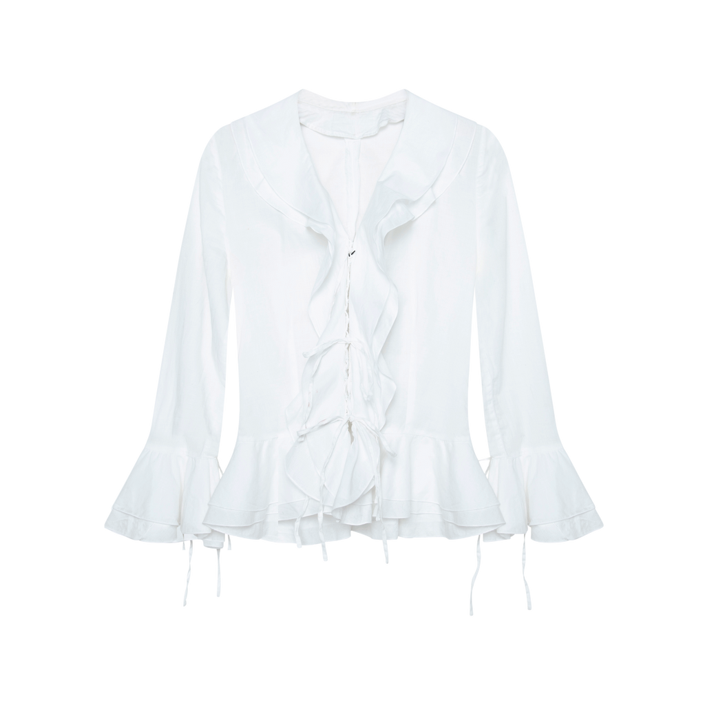 Vintage White Ruffled Blouse features front hook and eye closure, ties down front and sleeve cuffs, and ruffles down front, sleeves, and hem.