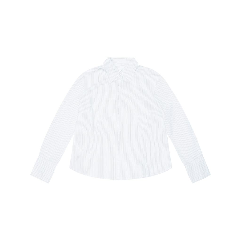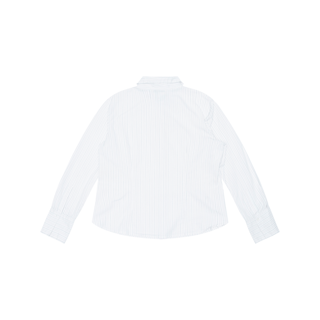 Vintage White Striped Button Up Shirt features red and blue pinstripe design, front button closure, and button at cuff.