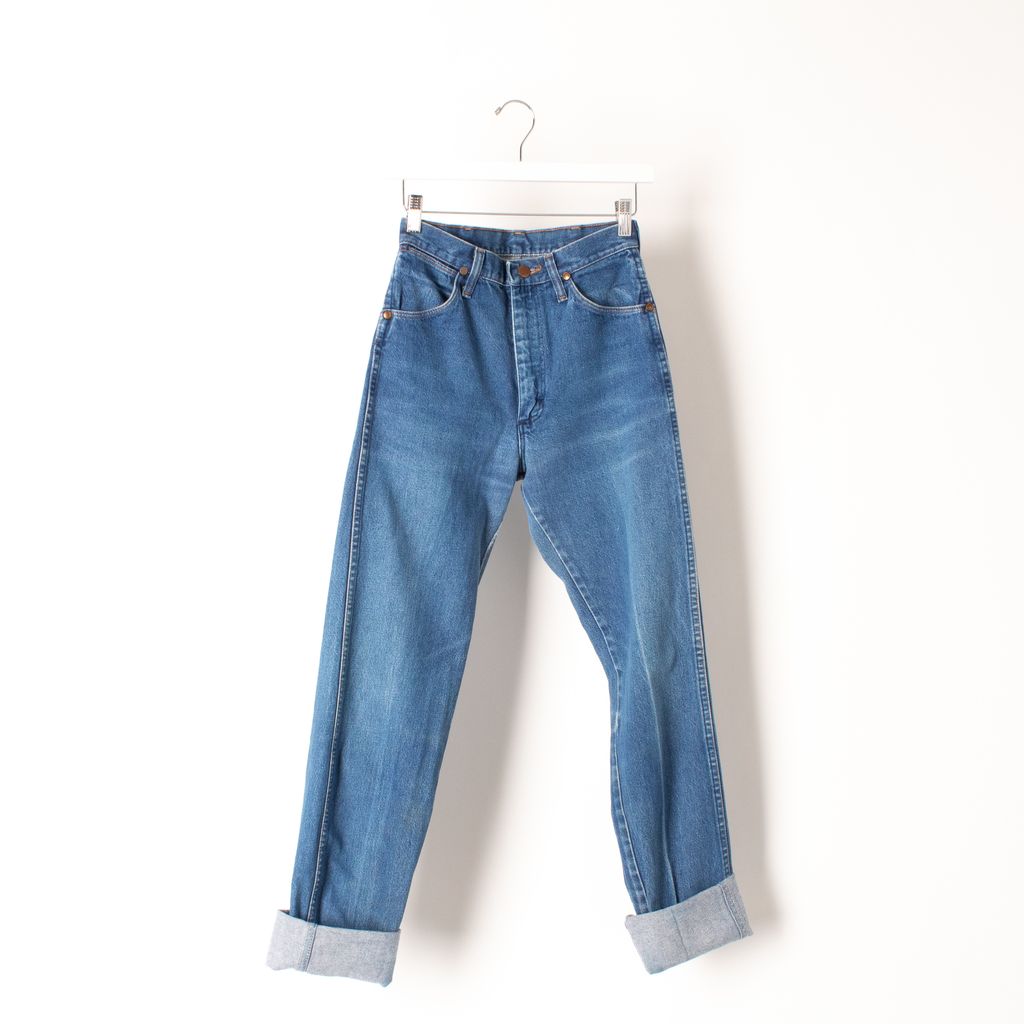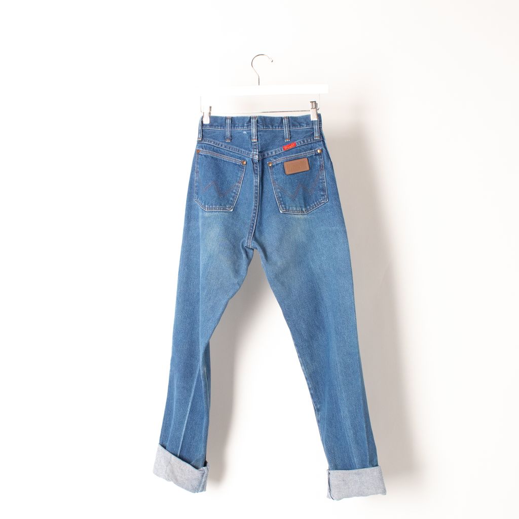 In great vintage condition, jeans from Wrangler. With a classic crisp dark wash, a zip fly button closure, five pocket styling and a relaxed straight leg fit, these pants are iconic.