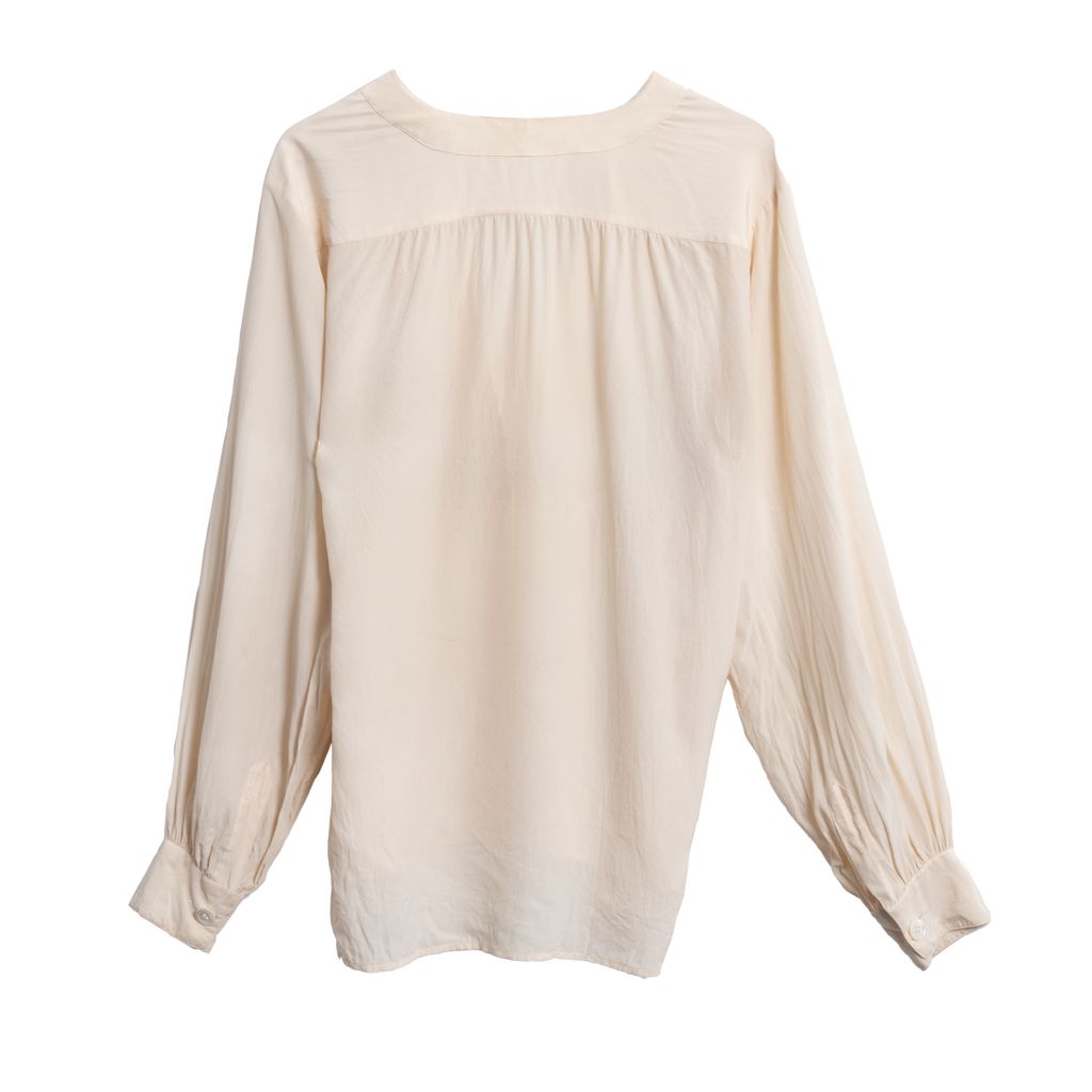 Vintage YSL Silk Blouse features deep cut design, button-down enclosure, and bishop sleeves.