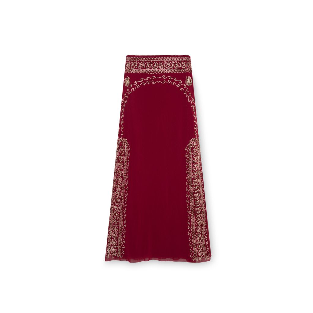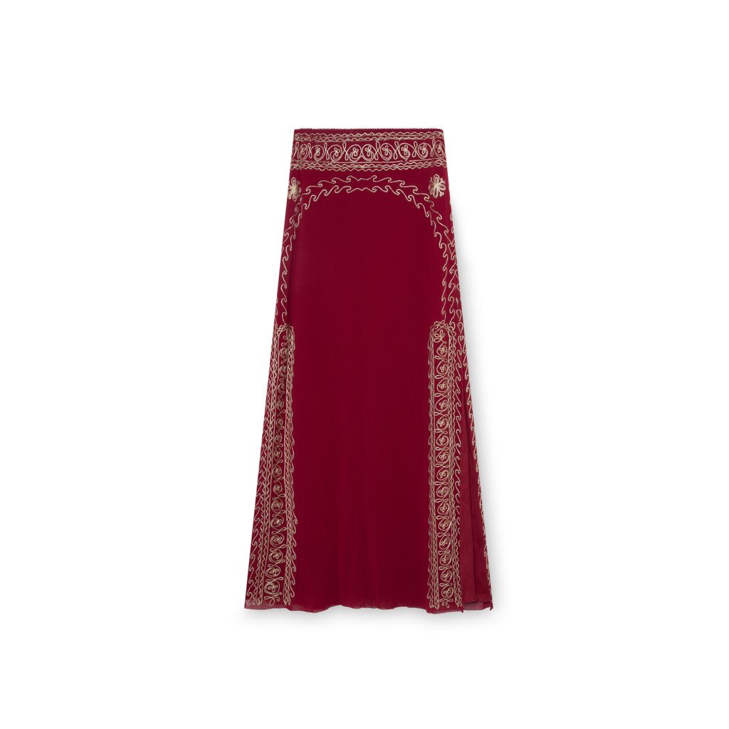 Vivienne Tam Red Maxi Skirt with Yellow Embroidery features yellow embroidered design, elasticated waist, and double side slits.