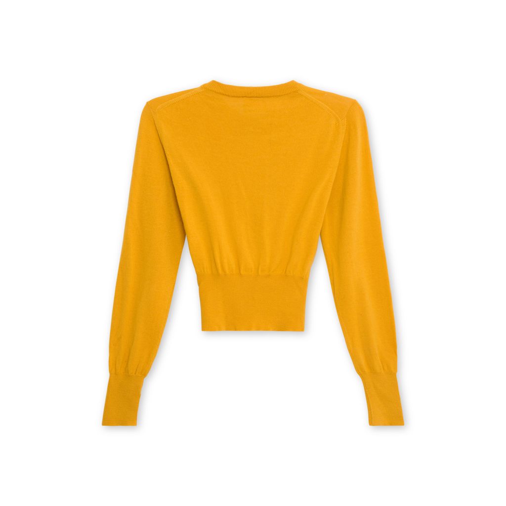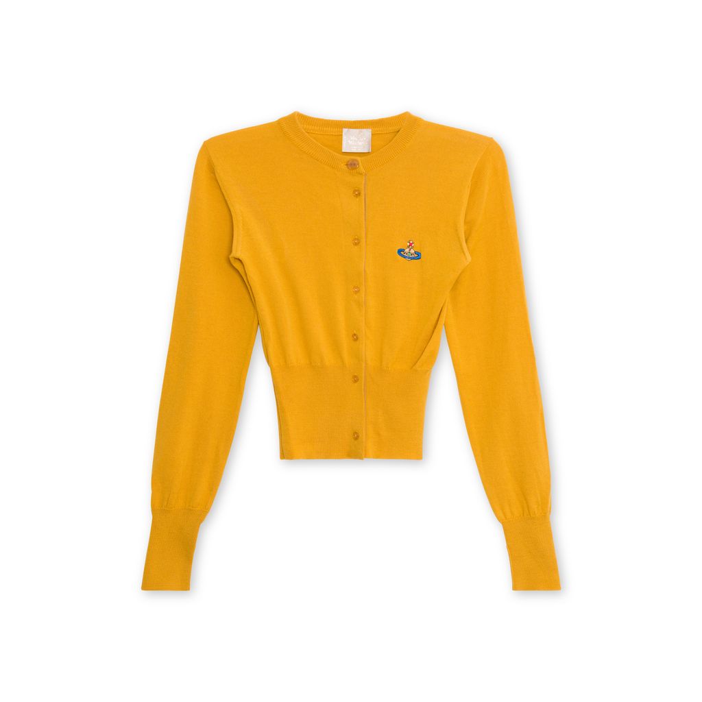 Vivienne Westwood Classic Wool Cardigan features button up closure, ribbing at collar, wrists, and hem, classic Vivienne Westwood patch at chest, 100% merino wool. Small hole on front right chest.