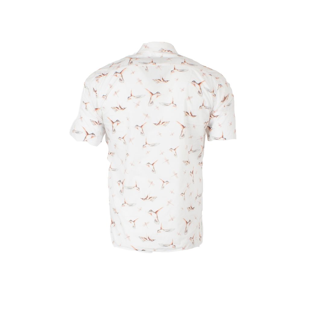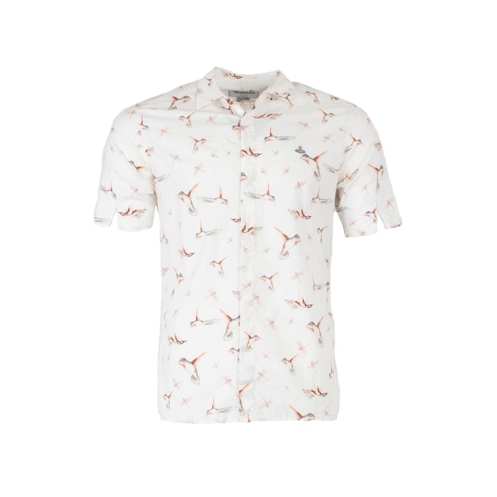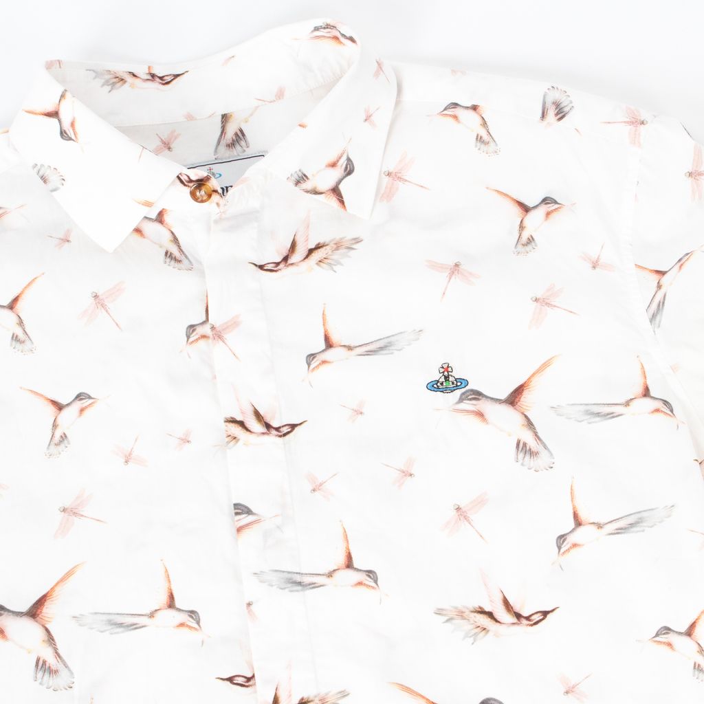 This whimsical button up from Vivienne Westwood is a cotton candy colored ornithological dream. Features all over muted hummingbird and dragonfly print, tortoiseshell buttons, button down front closure, Vivienne Westwood logo embroidered on chest, and small side slits at bottom hem.