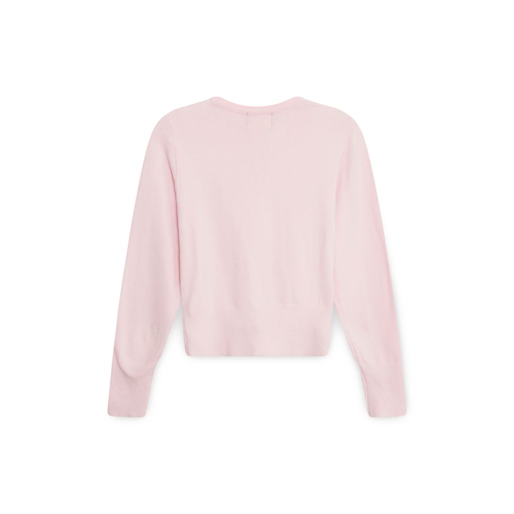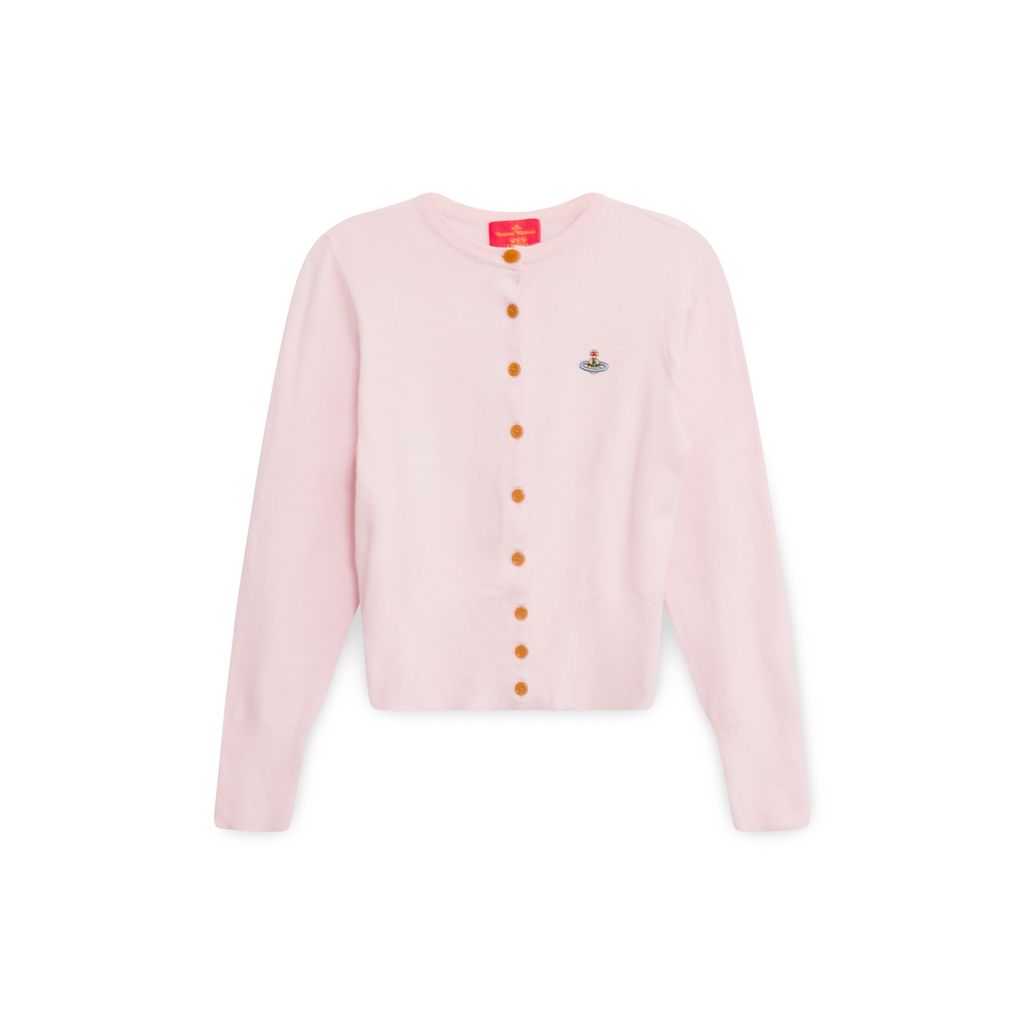Vivienne Westwood Pink Cardigan features button closure, embroidered logo on left chest, light pilling throughout.