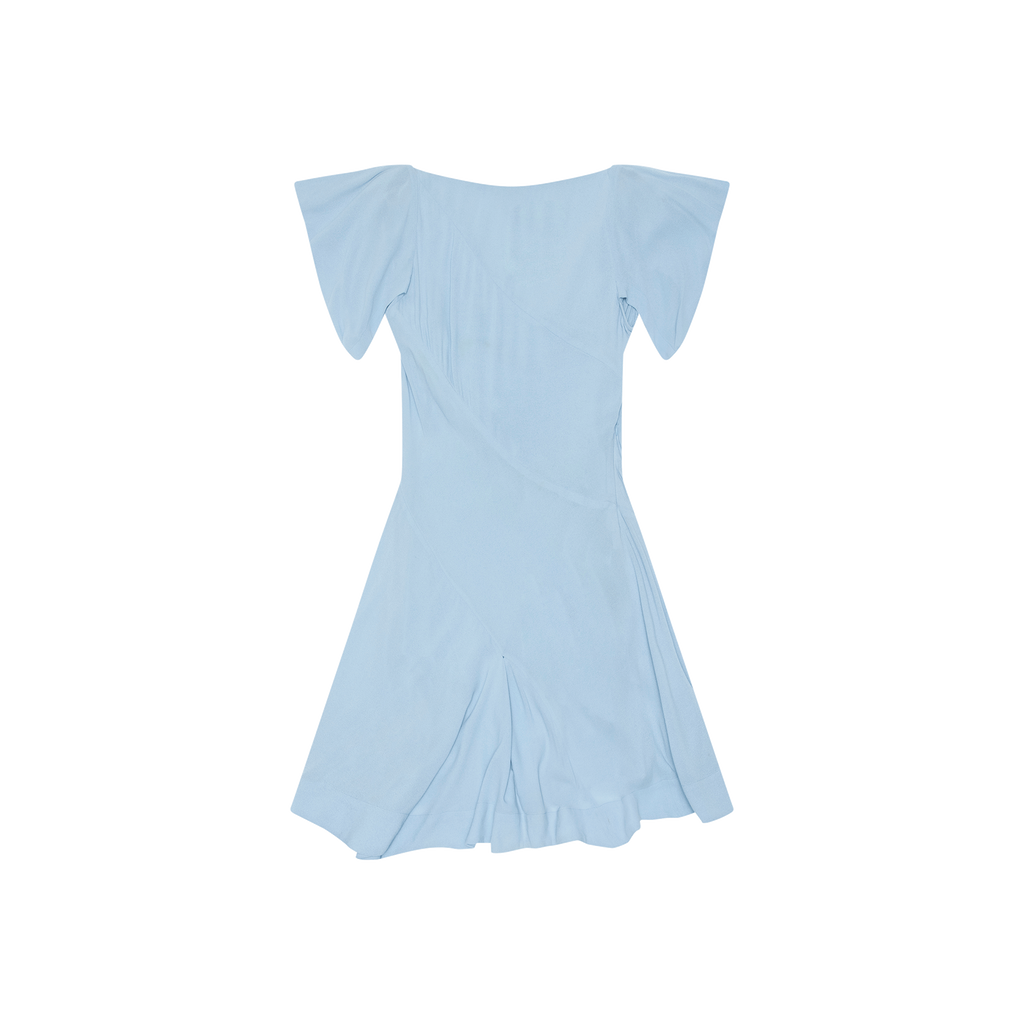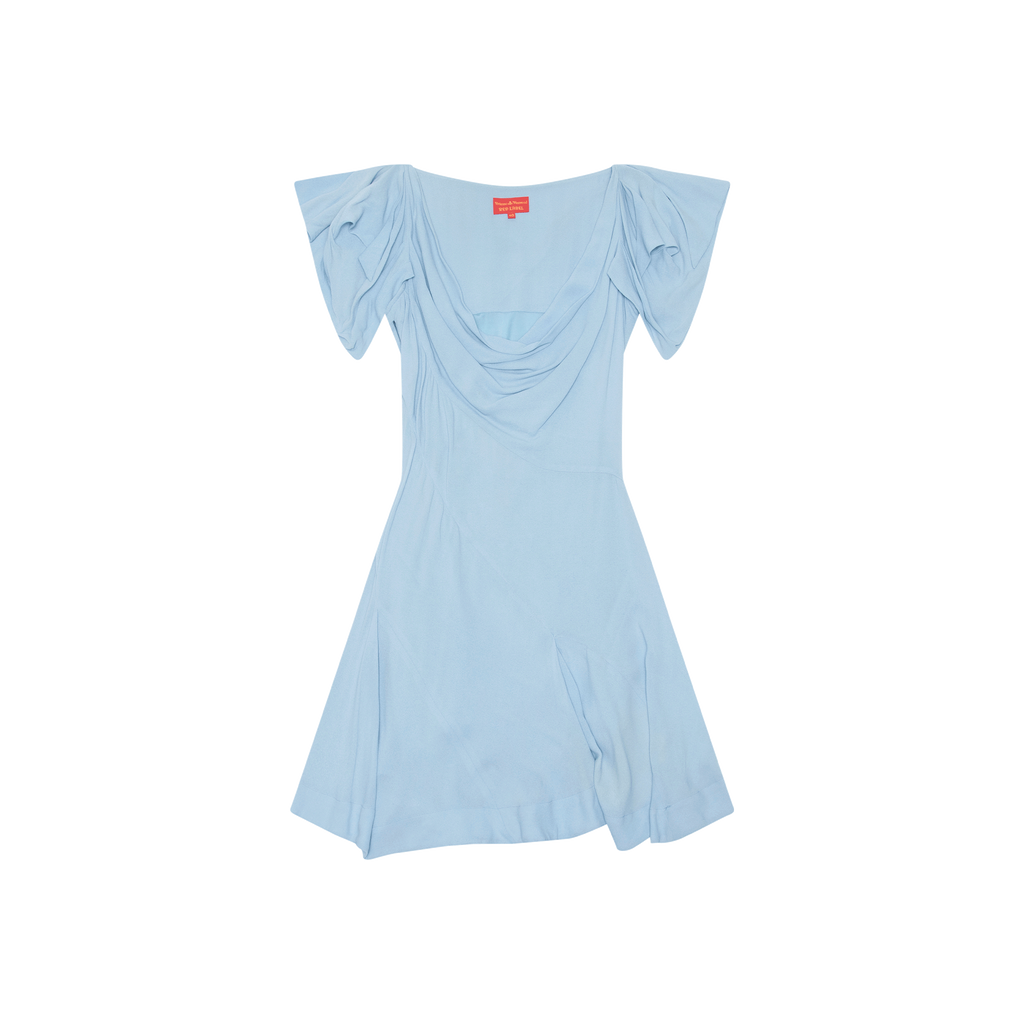 Vivienne Westwood Red Label Baby Blue Dress features cowl neck, bias cut, and hidden side zipper.