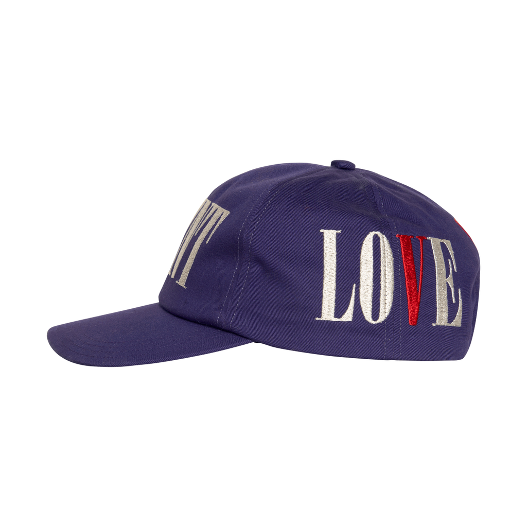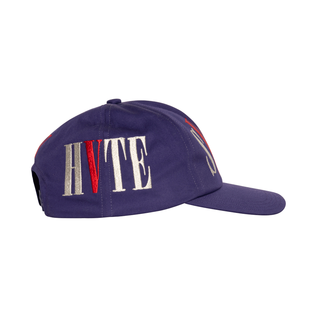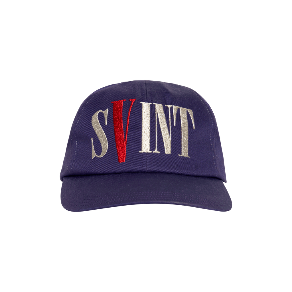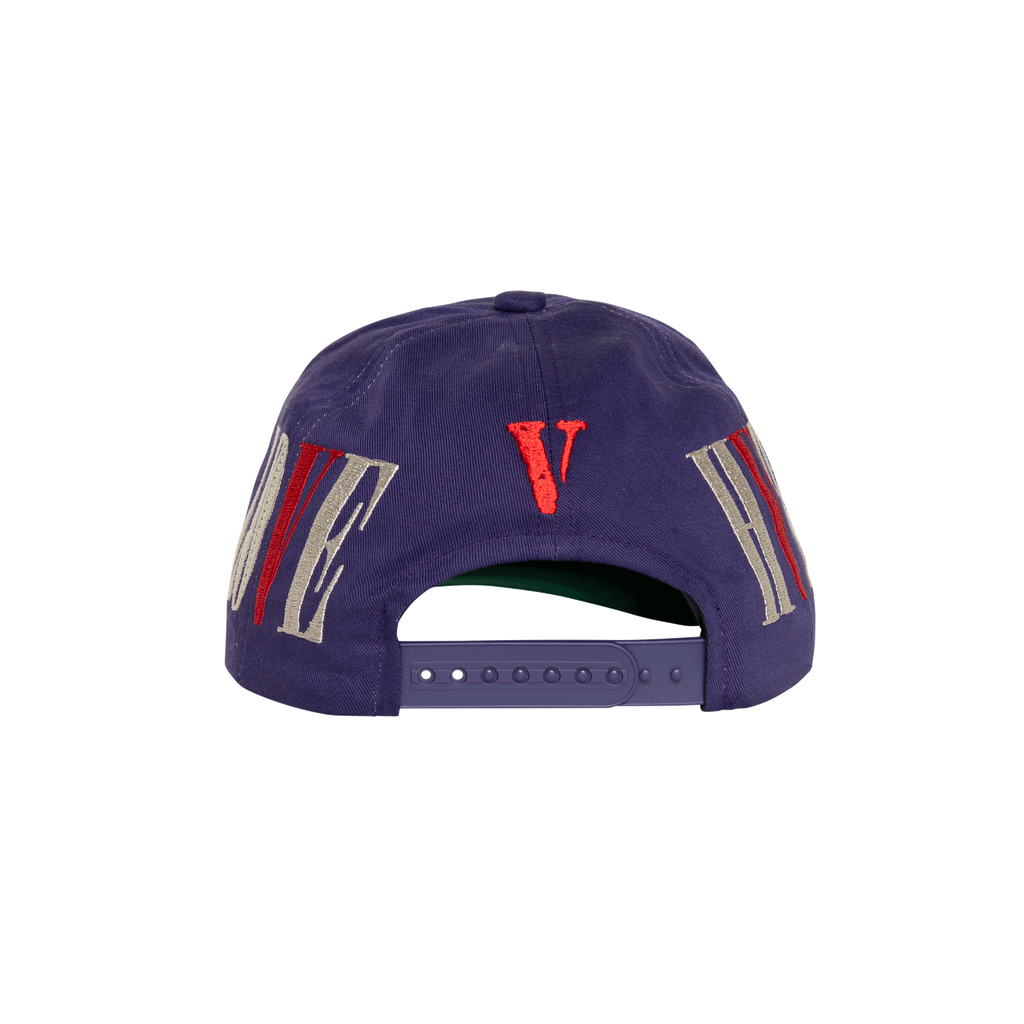 Vlone x Saint Michael Purple Snapback features embroidered graphics on front, sides, and back, and adjustable snap button closure.