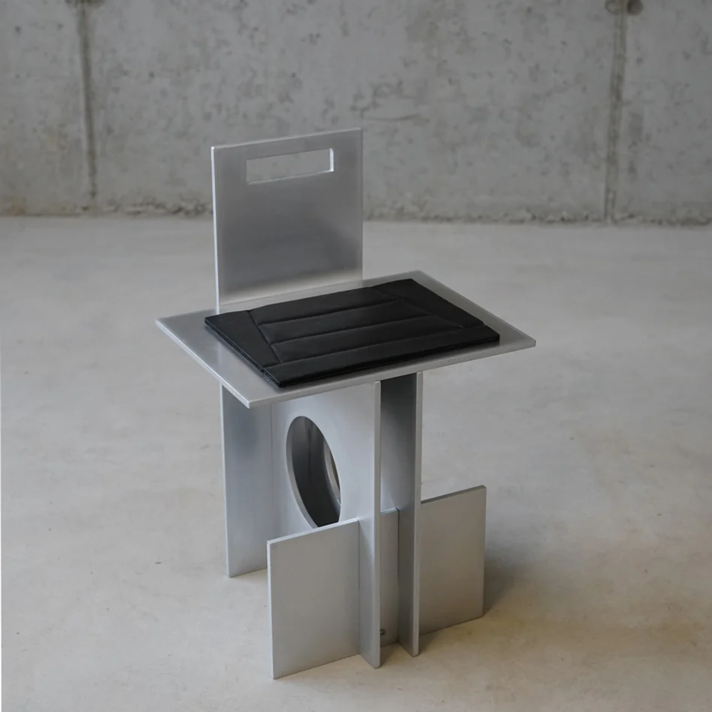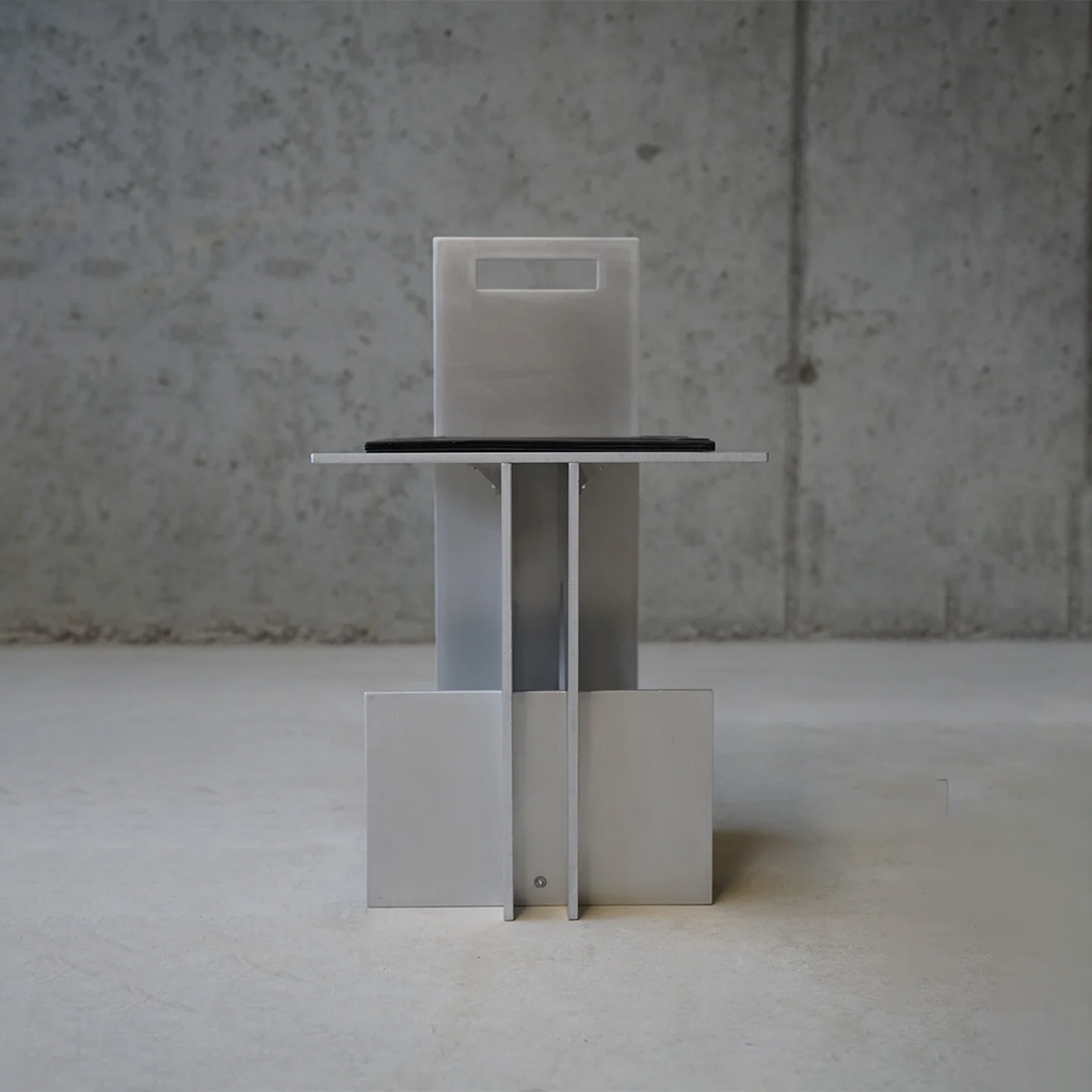The "Void" aluminum Chair with a leather seat. Designed in 2024 and made by artist Jakub Kubica in his atelier near Berlin in a numbered limited collection. The Aluminum has been hand-sanded and protected with natural bee wax from leaving fingerprints and smudges, making it easier to maintain.
