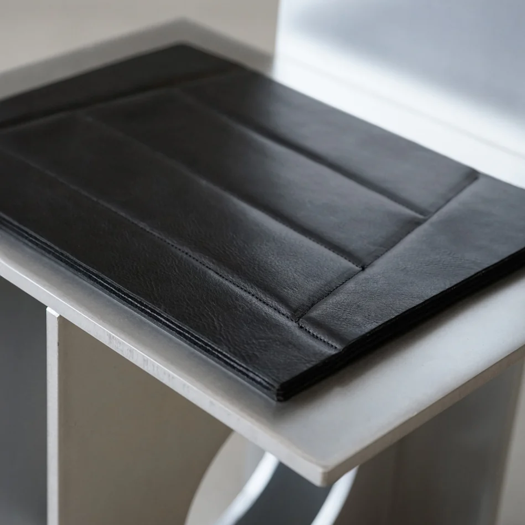 The 1 cm thick seat is cushioned with an organic felt cover and stitched from both sides with vegetable-tanned leather from Tuscany, Italy. The calf leather is dyed through, treated with a wax finish, and tumbled for softness. Due to its timeless look and beautiful aging, the leather has a very organic and unique look.