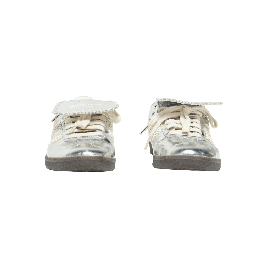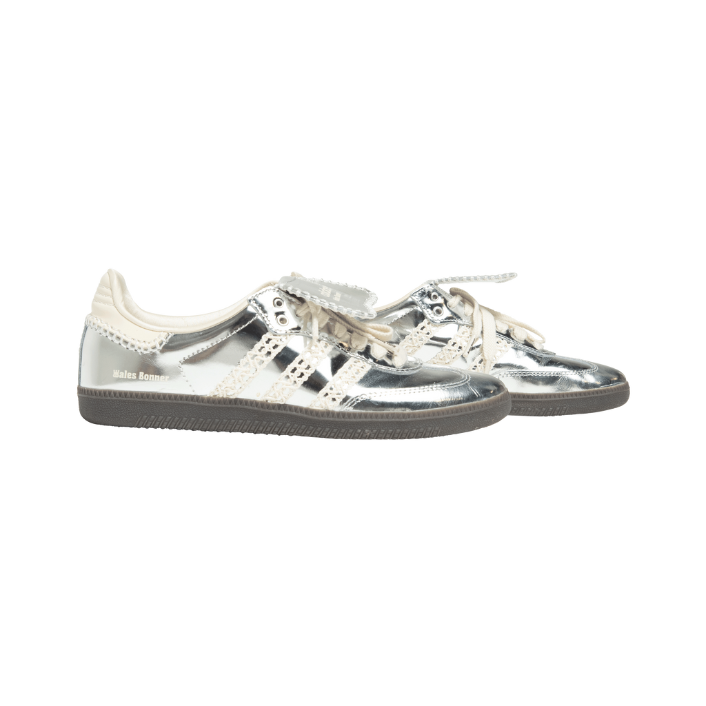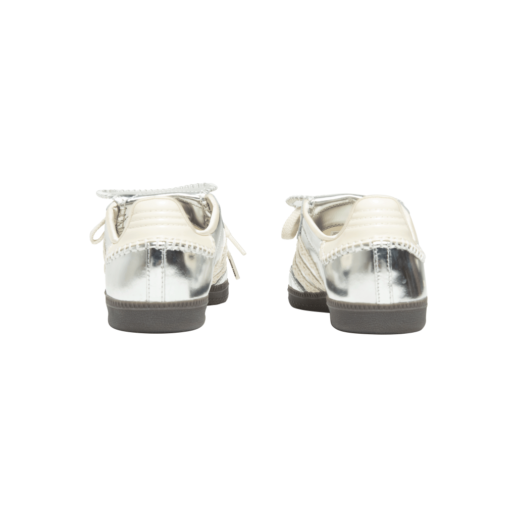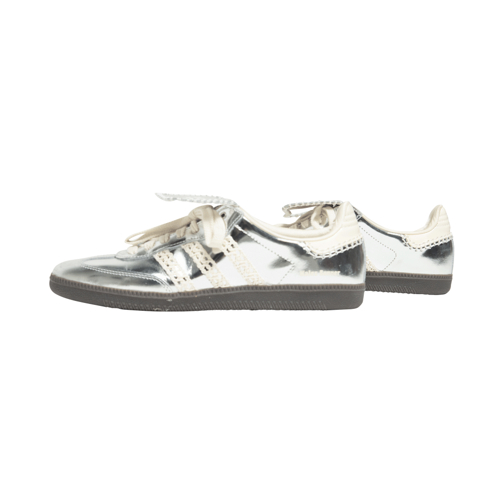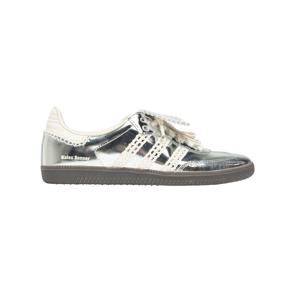 Wales Bonner x Adidas Silver Sambas features glossy silver finish, woven 3 stripe design, and fold over tongue.