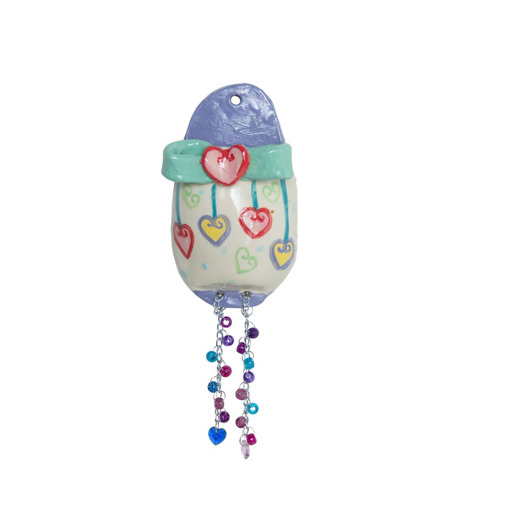 Wall Hanging Flower Pocket features green bow detail, heart design painted on, and chains and beads hanging from bottom.