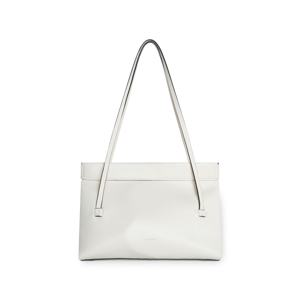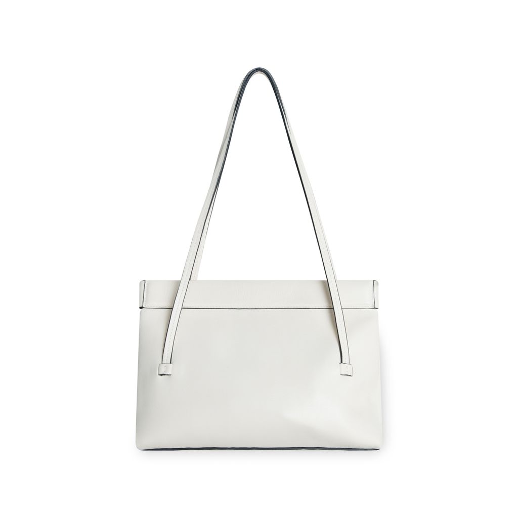 Wandler White Leather Shoulder Bag features gold embossed logo on front, double straps, and magnetic closure.