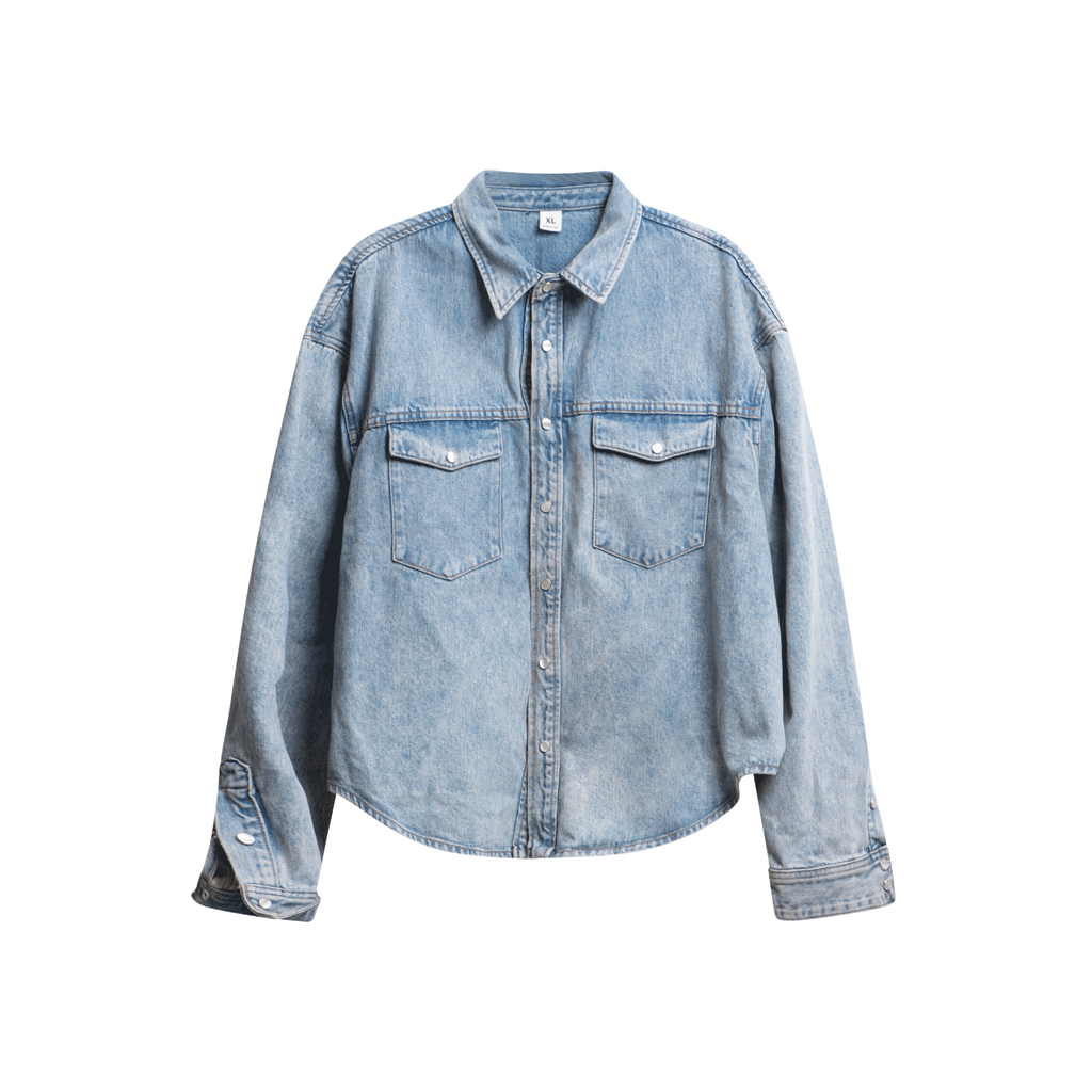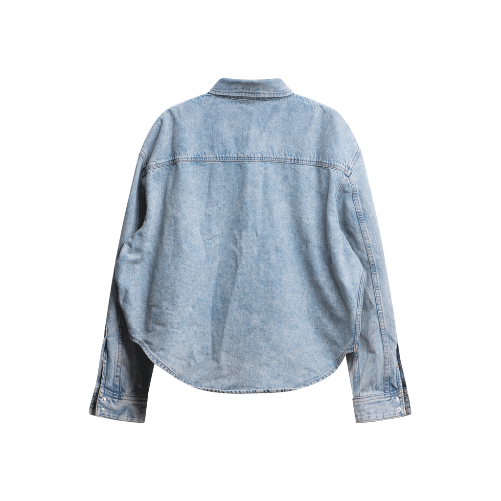 Wardrobe.NYC Denim Jacket features snap up closure, two front pockets, adjustable cuffs, boxy fit.