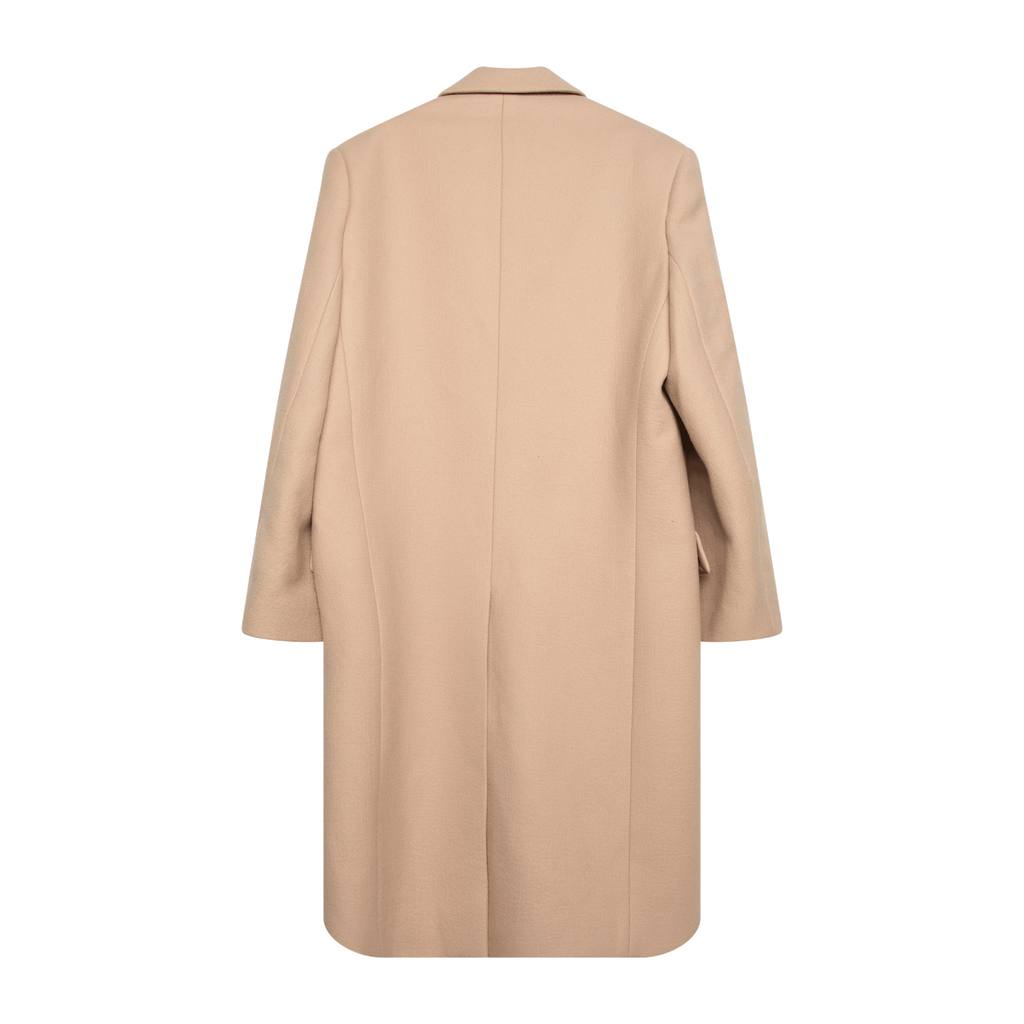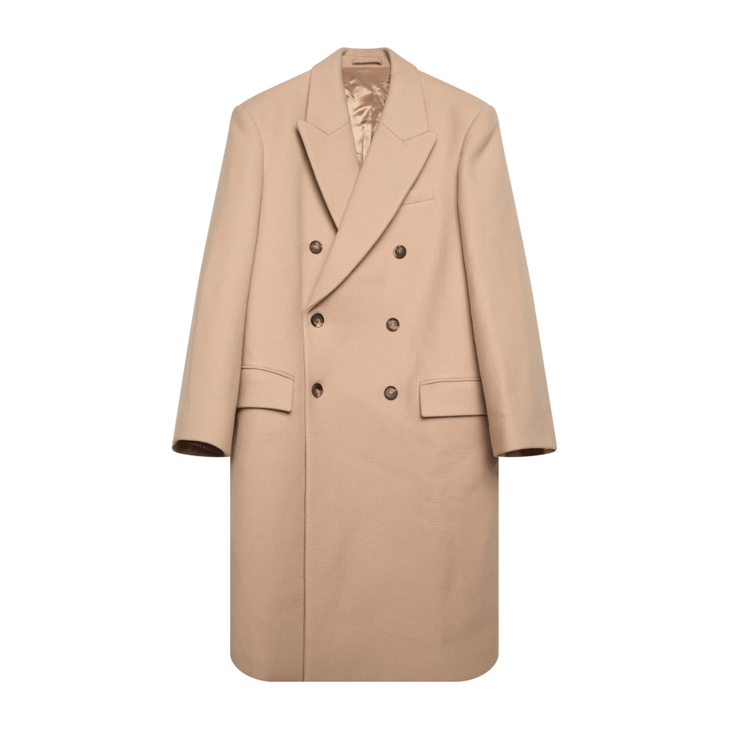 Wardrobe.NYC x Hailey Bieber Wool Coat features double breasted front button closure, side patch pockets, breast welt pocket, padded shoulders, oversized fit.