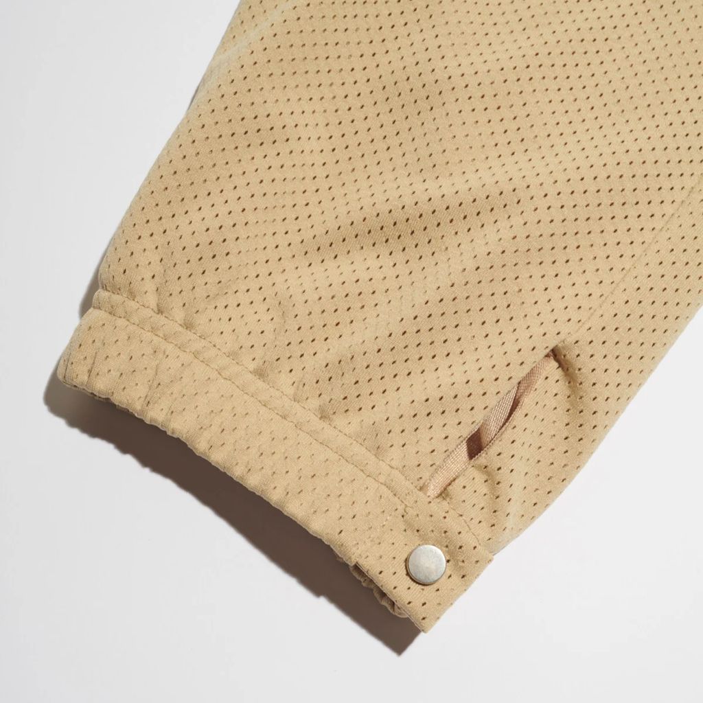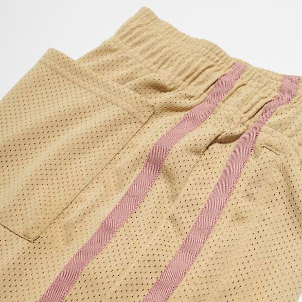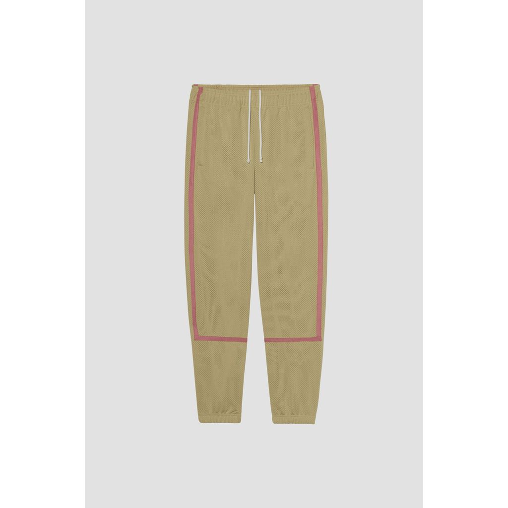 Warm Up Pants are inspired by classic basketball warm ups and features our signature heavyweight eyelet mesh, full lining with breathable tricot lining, contrast Japanese grosgrain creates athletic stripes at either side, pockets at either side with zipper enclosures, patch pocket on back right side, drawcord at the waistband, snap button at the leg opening for options when styling, and drawcord at the waistband.