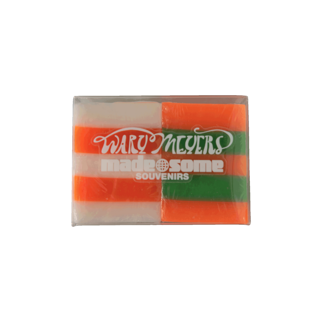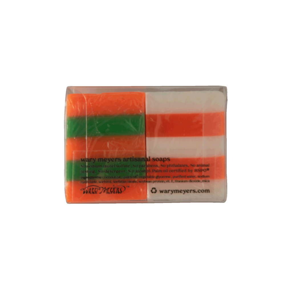 Wary Meyers x Made Some Souvenirs Travel Soaps feature 2 different scented soaps- Grapefruit Bellini (orange and white stripes) and Limoncello (green and orange stripes).