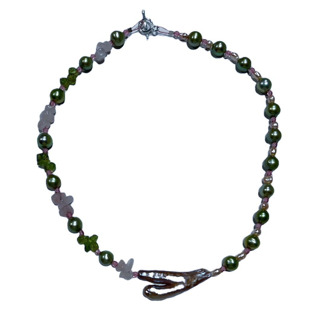 Watermelon Rose necklace features a combination of freshwater and branch pearls, rose quartz, and peridot with 925 silver hardware.