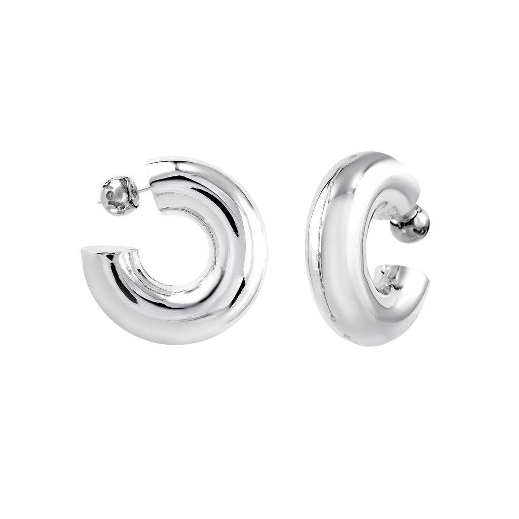 Classic doughnut hoops playfully elevated. The process becomes the ornament. Welding spots run across the silver body. 925 Sterling Silver, pure silver plated