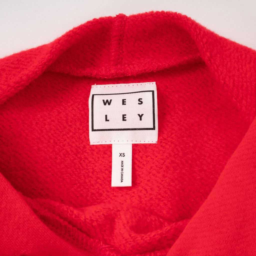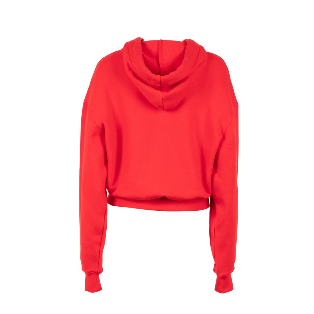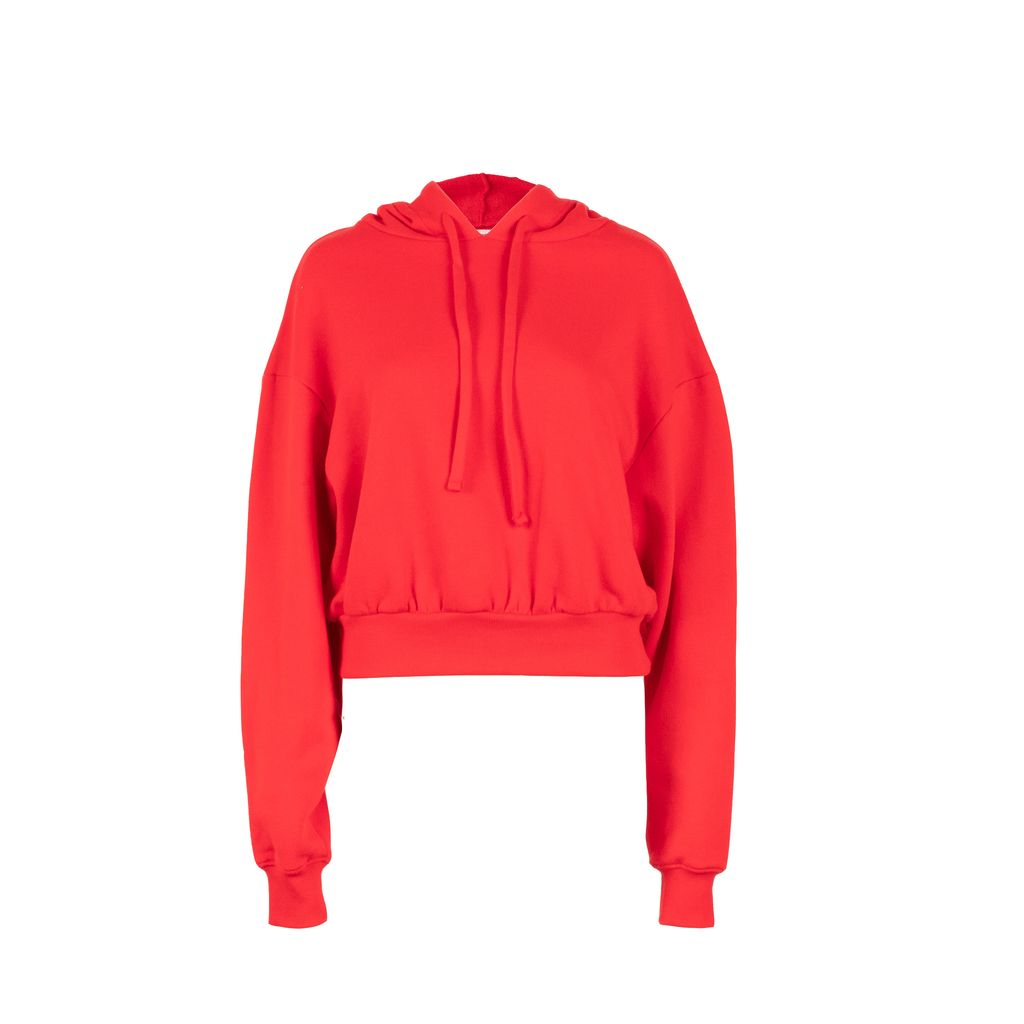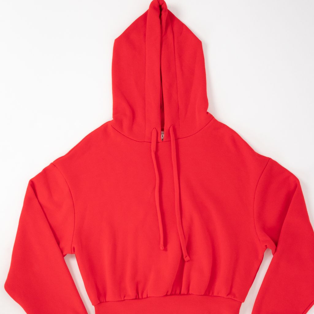 This bright red cropped hoodie from Wesley is a perfect match to your favorite strappy heel or your bunny slippers. Pair with the matching sweatpants for all day comfortable chic. Features full hood with tonal pull ties, long sleeves with drop shoulders, and rib knit bands at wrists and waist.
