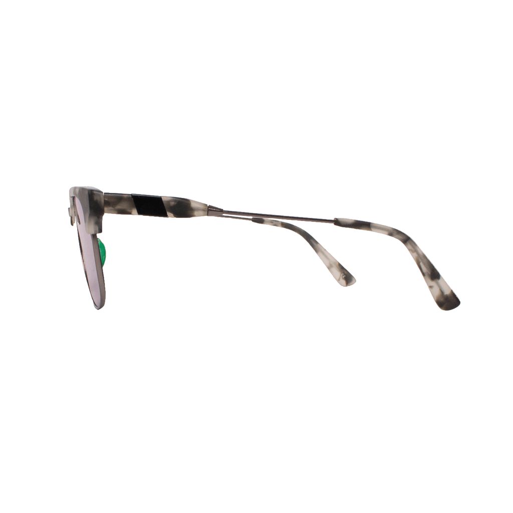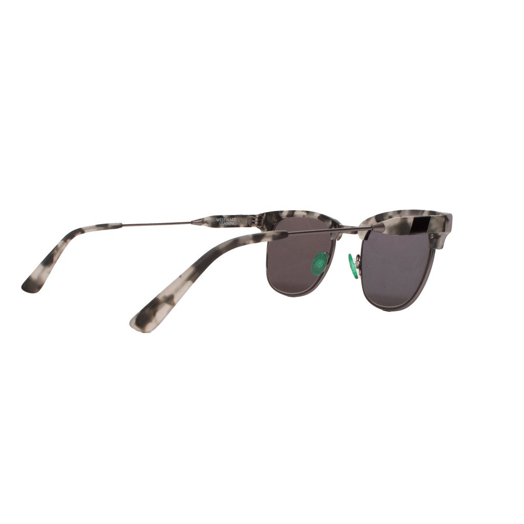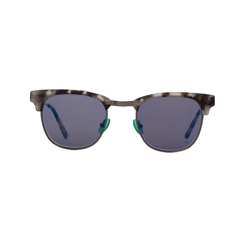 These vintage-inspired Westward Leaning sunglasses have a retro style grey tortoise half frame with a metallic lens frame, contrast green silicone nose pads, and metal arms with tortoise ends. Hardshell case and cleaning cloth included.