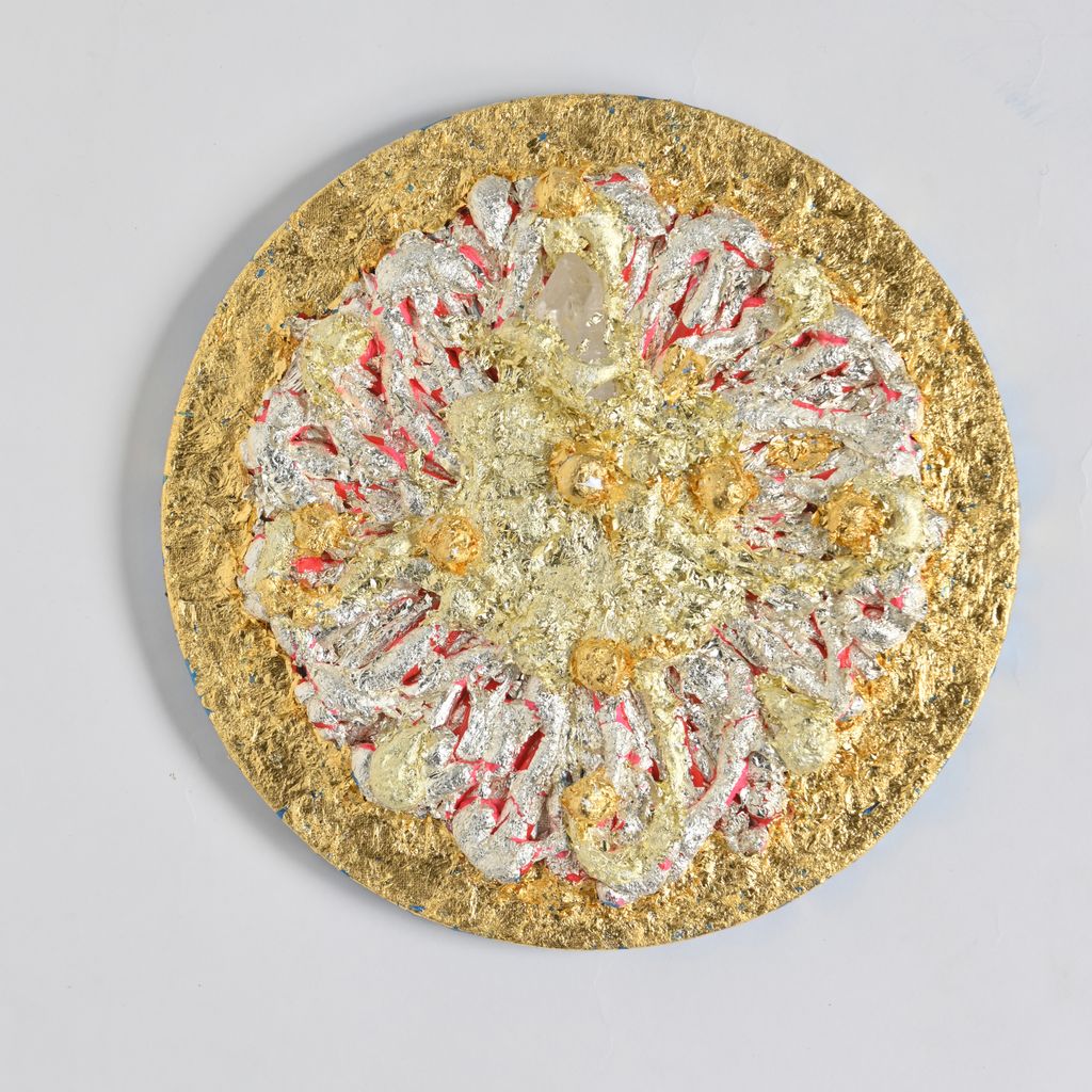 Whispers of Angel Gabriel: The Miracle of Florida 「エンジェルガヴリエルのささやききより」「フロリダの奇跡」by Keiko Moriuchi, 2025 is acrylic on canvas with 24k gold leaf, 18k white gold leaf, and himalayan crystal.