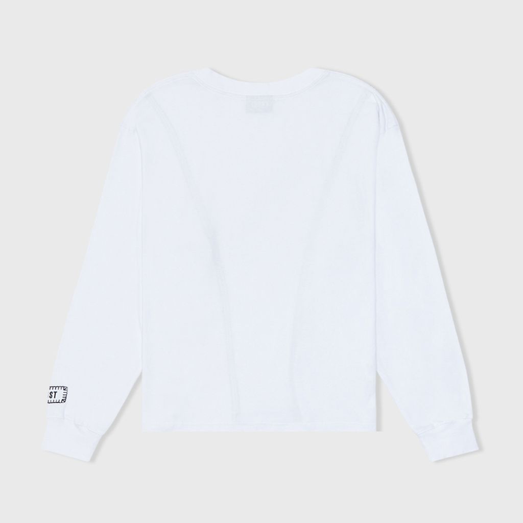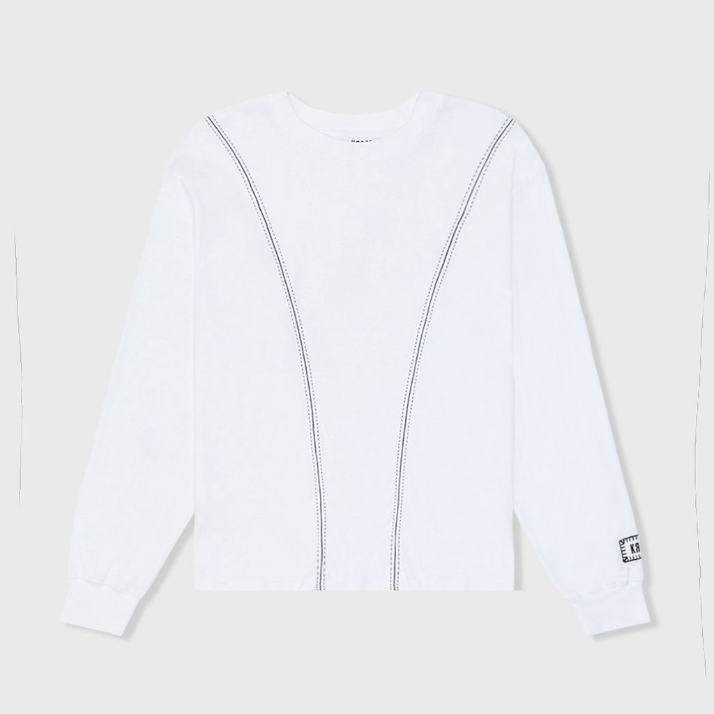 This stylish white long sleeve t-shirt features baseball inspired black stitching going down the front.