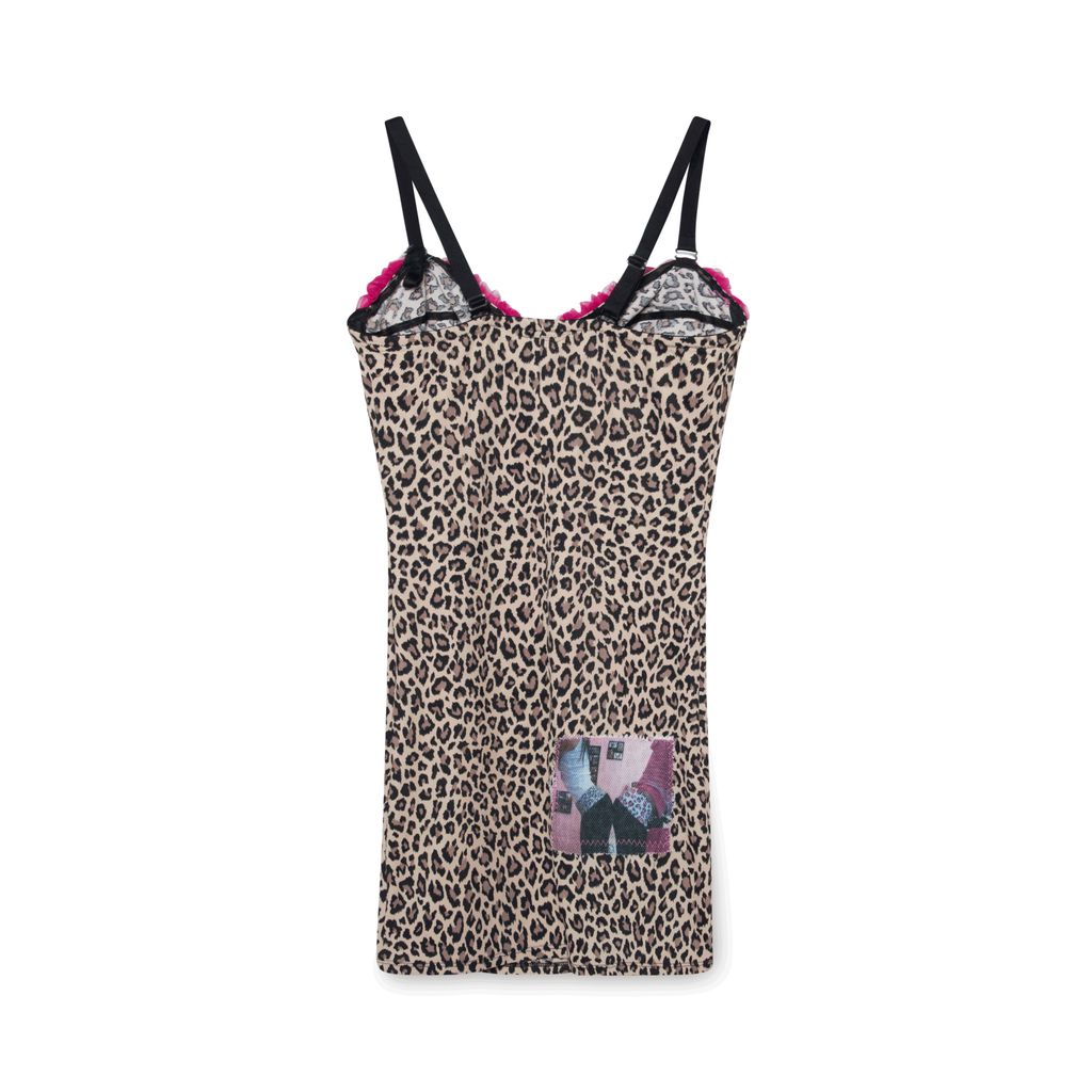 White Castle Dress features leopard print pattern, boning under the chest, decorative patching, and pink lace accents.