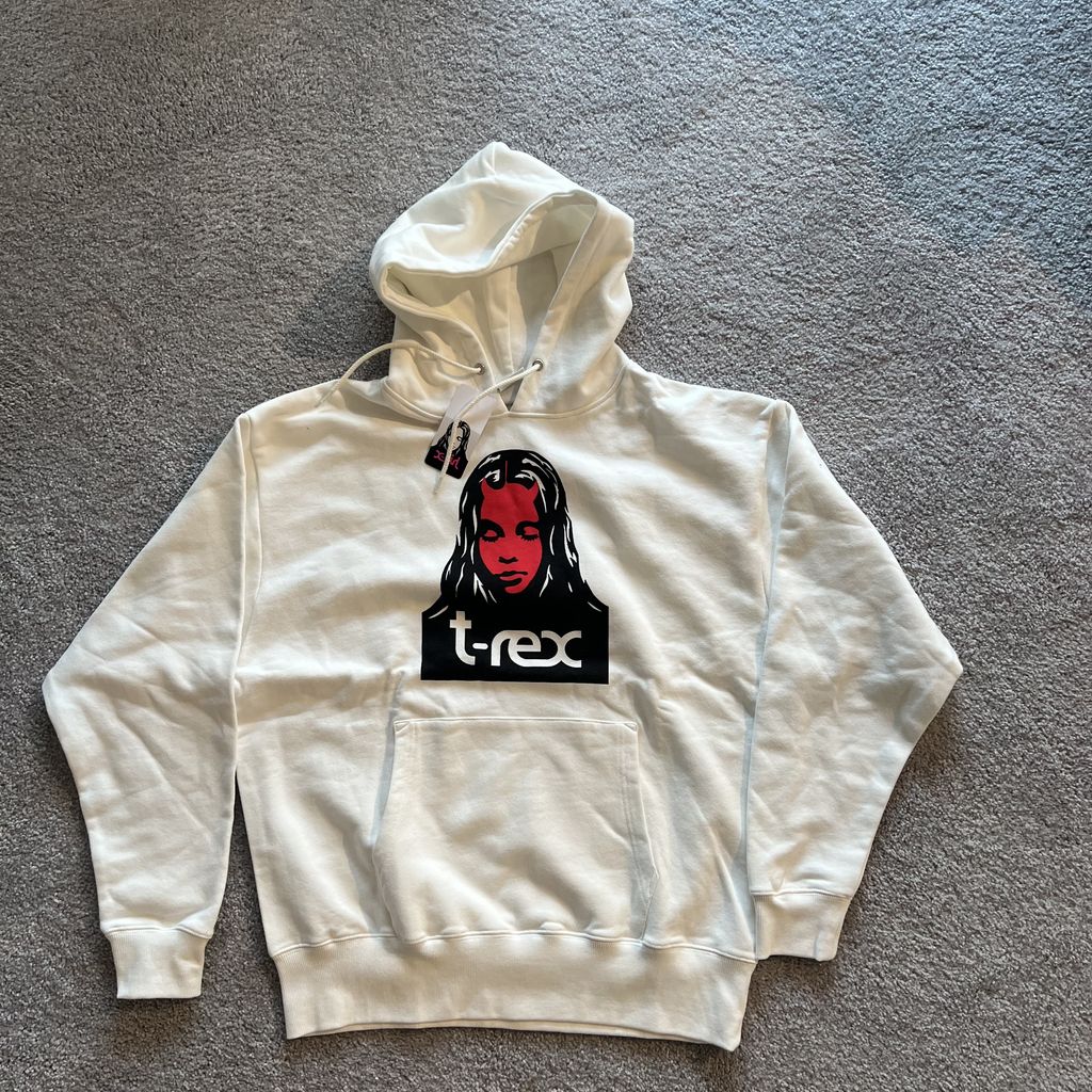 White Hoodie features drawstrings at hood, graphic on front, and kangaroo pocket.