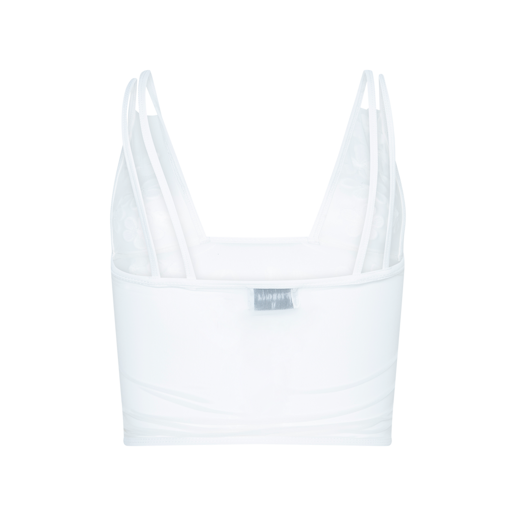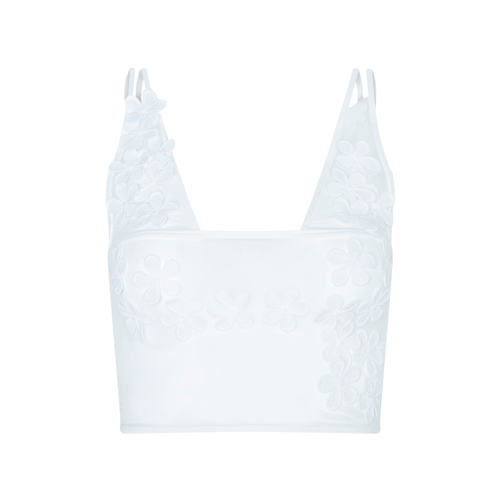Marcia Top - White features double straps, cropped length, and white flowers in a barely there net fabric.