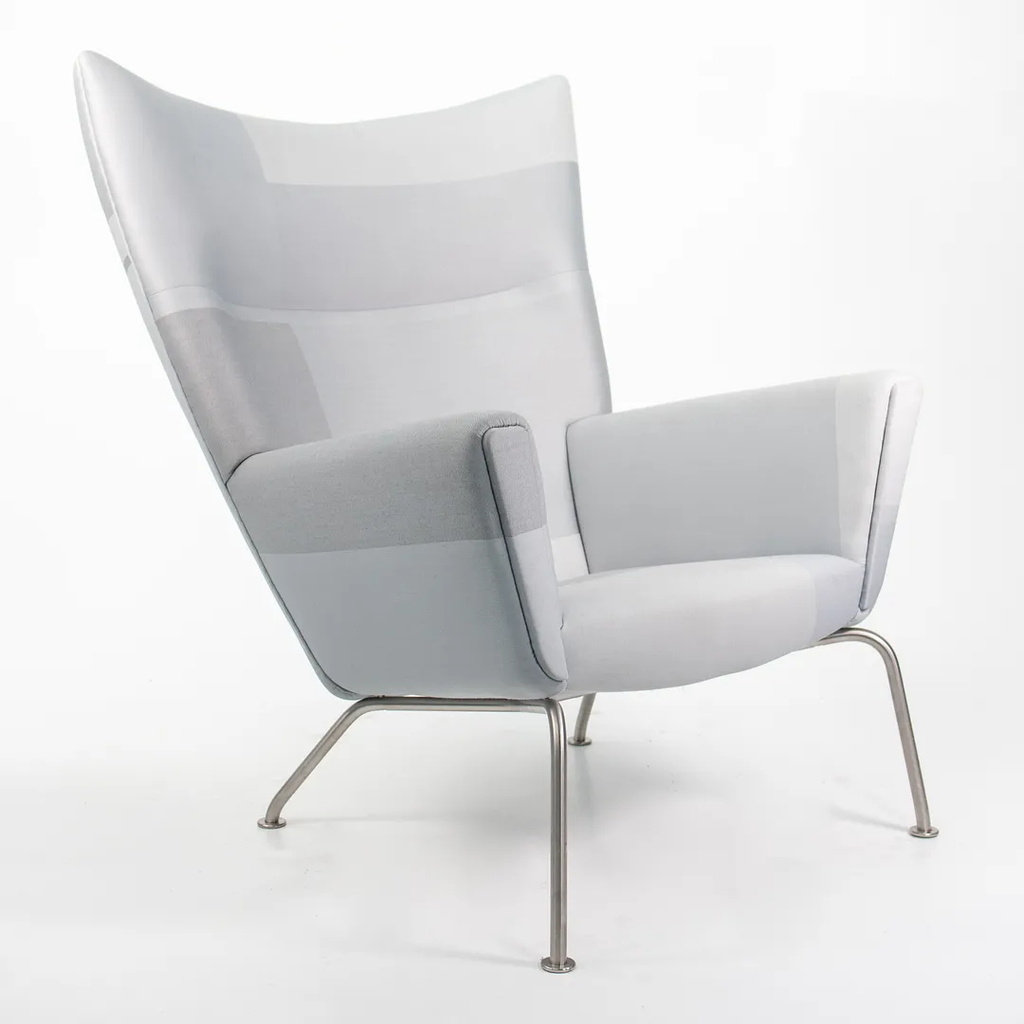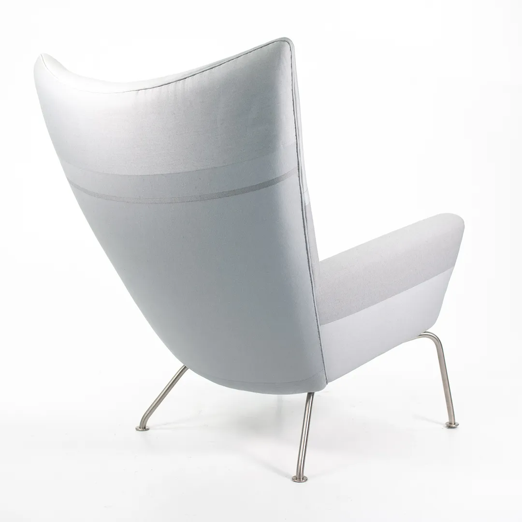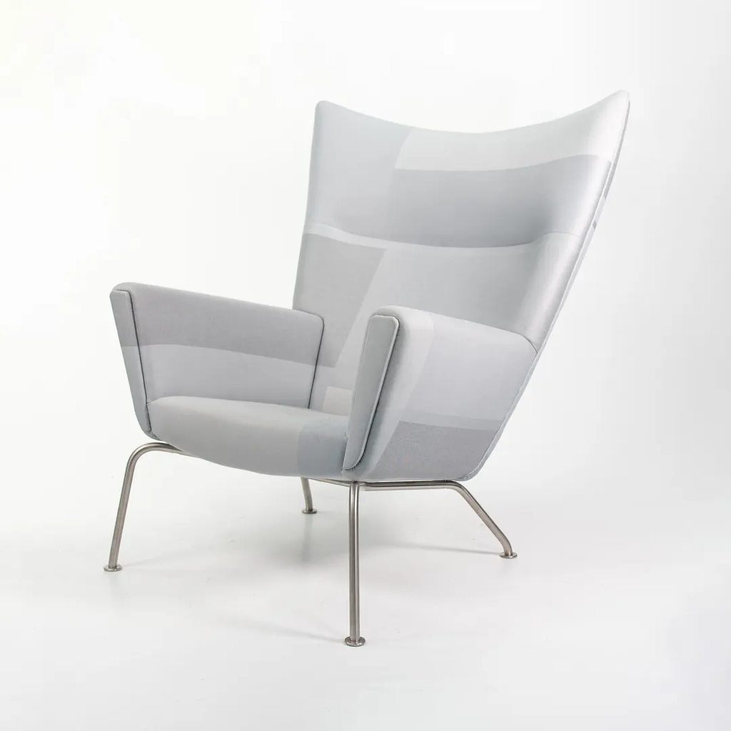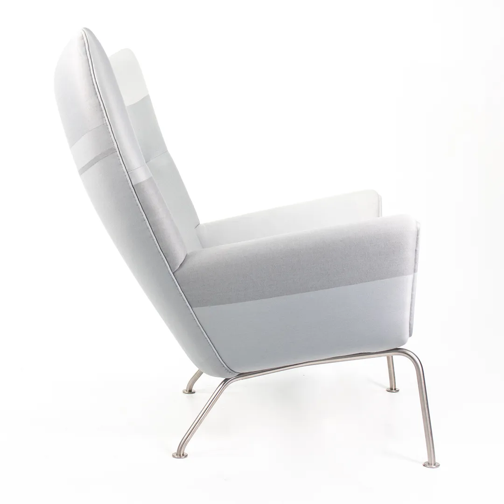 Listed for sale is a CH445 Wing Lounge Chair, made with a stainless steel frame and grey color blocked fabric. The chair was designed by Hans Wegner and produced by Carl Hansen & Son in Denmark. The chair dates to circa 2020 and is guaranteed as authentic. Condition is excellent overall and may show light wear only from storage and transportation to our warehouse. This chair has not been used in a home or office setting. See photos. The fabric appears to be a custom order from Carl Hansen, where an interior designer likely specified and sent in the Customer's Own Material (COM).