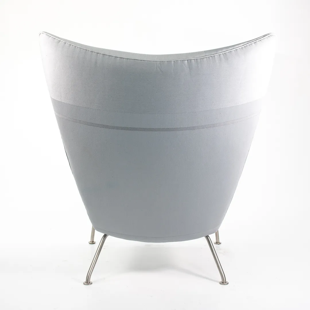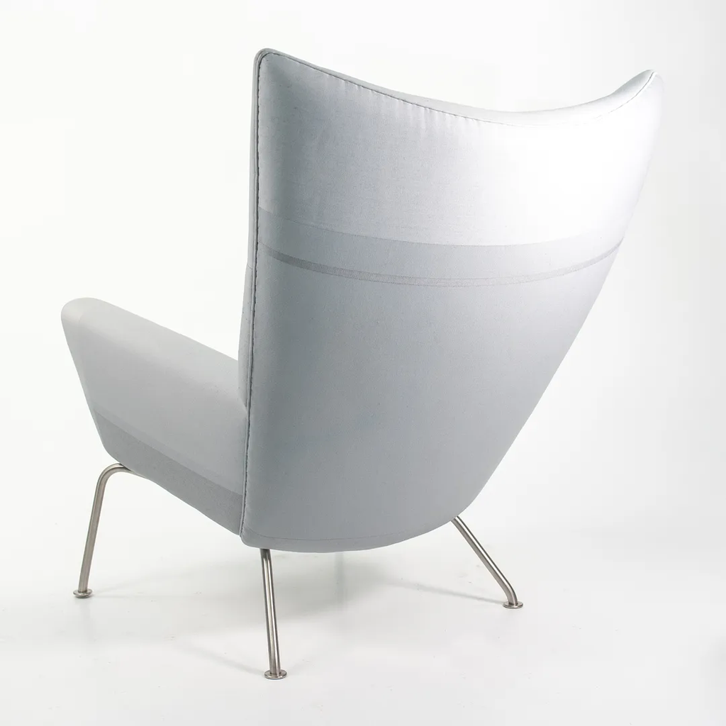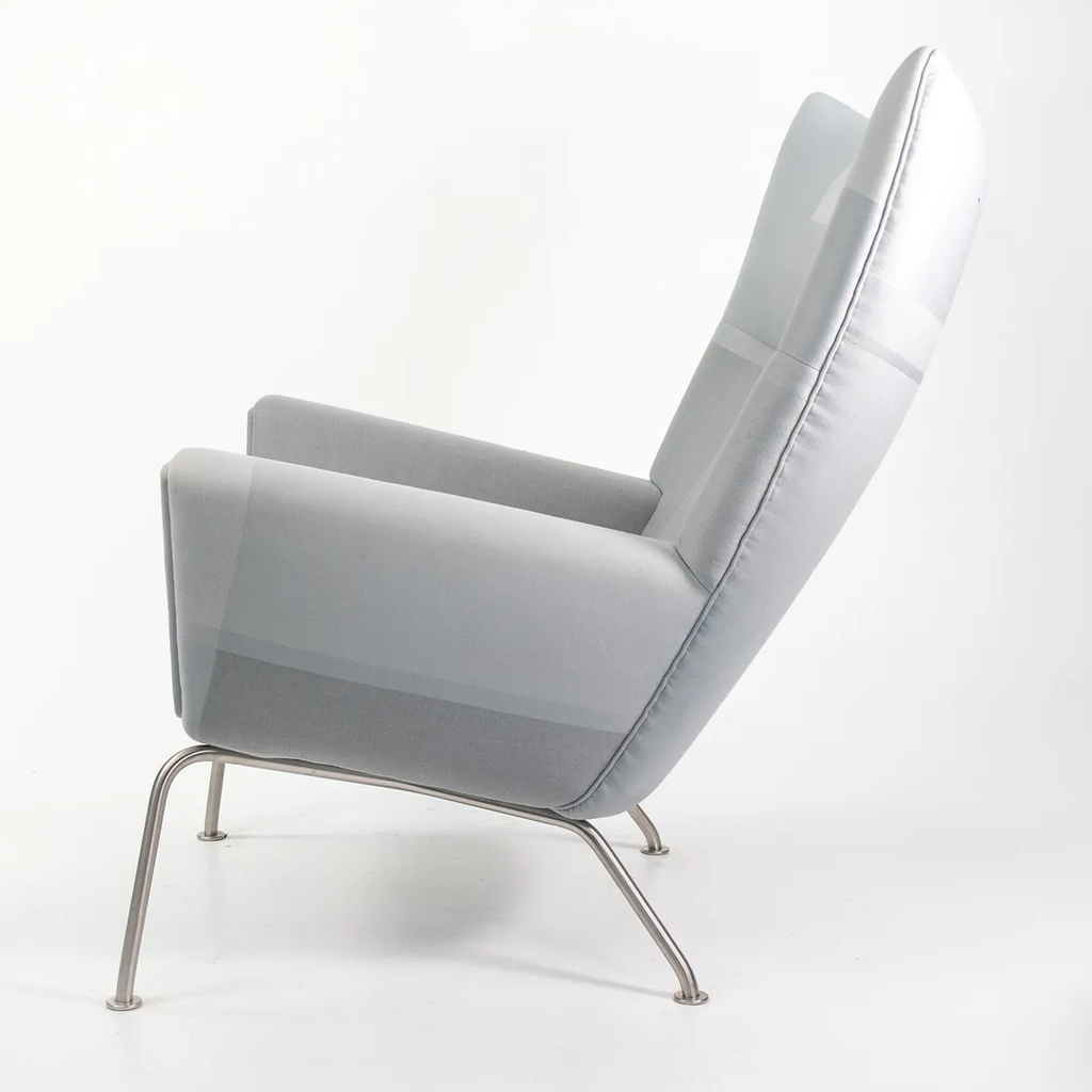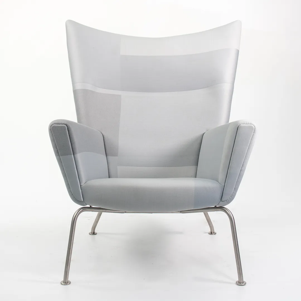 Listed for sale is a CH445 Wing Lounge Chair, made with a stainless steel frame and grey color blocked fabric. The chair was designed by Hans Wegner and produced by Carl Hansen & Son in Denmark. The chair dates to circa 2020 and is guaranteed as authentic. Condition is excellent overall and may show light wear only from storage and transportation to our warehouse. This chair has not been used in a home or office setting. See photos. The fabric appears to be a custom order from Carl Hansen, where an interior designer likely specified and sent in the Customer's Own Material (COM).