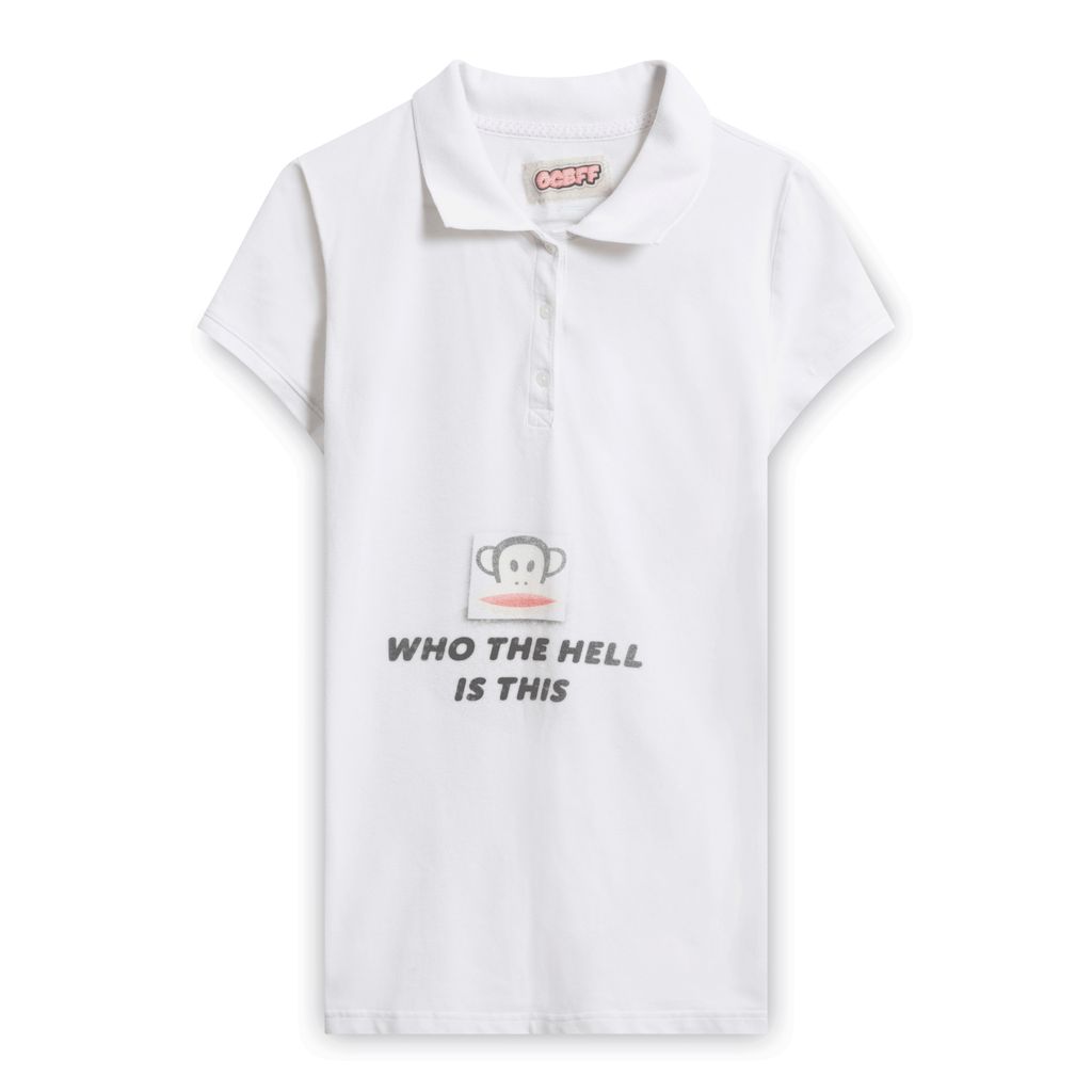 White polo shirt with printed monkey and "Who the Hell is This" text.