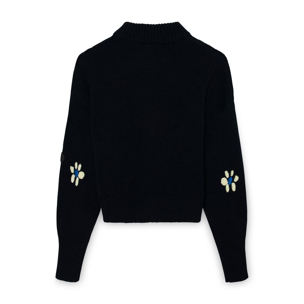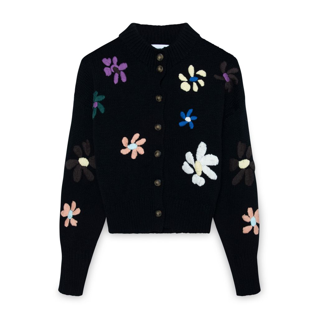 Who What Wear Mimi Cardigan features seal wool fabrication, mock-neck, and floral hand embroidery.