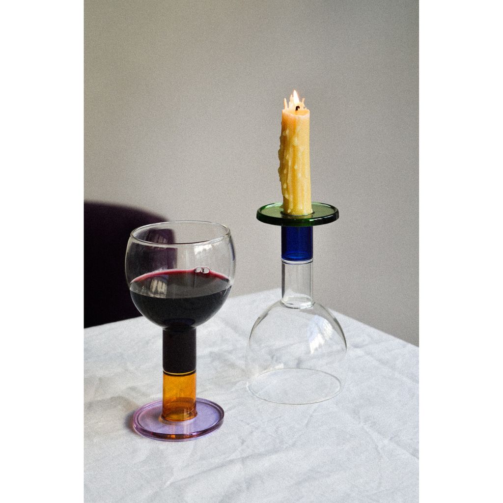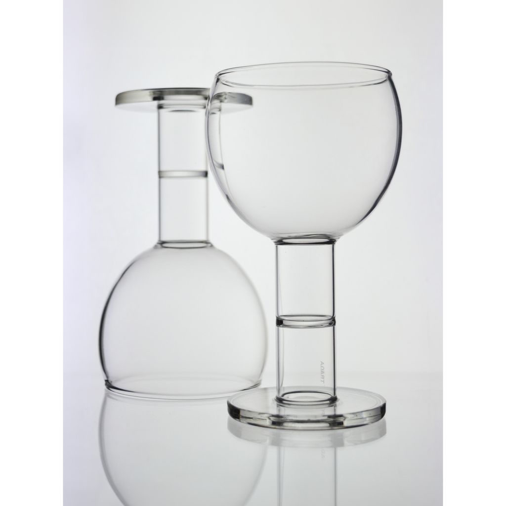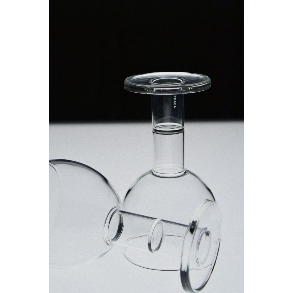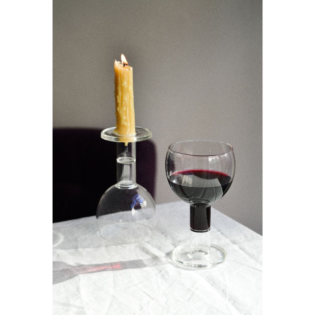 A bifunctional glass: one side a wine glass, on the opposite side a candle holder. Both designs blend seamlessly into a single piece that mirrors the classical 'taverna' style glass. The wine glass features an extended bottom end, maximizing liquid volume while ensuring easy cleaning accessibility. Crafted from borosilicate glass, known for its durability and temprature resistance, it is ideal for both hot and cold beverages. This glass is dishwasher safe.
