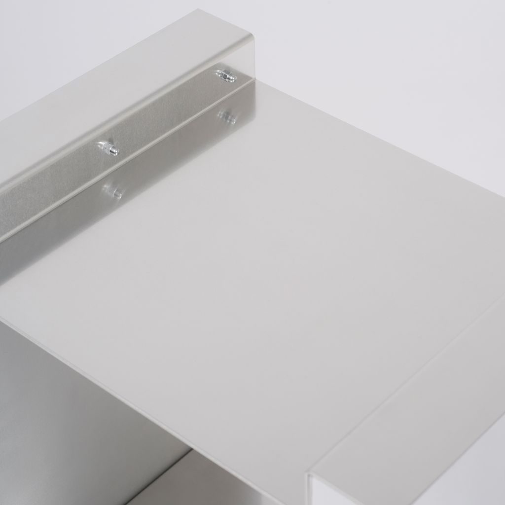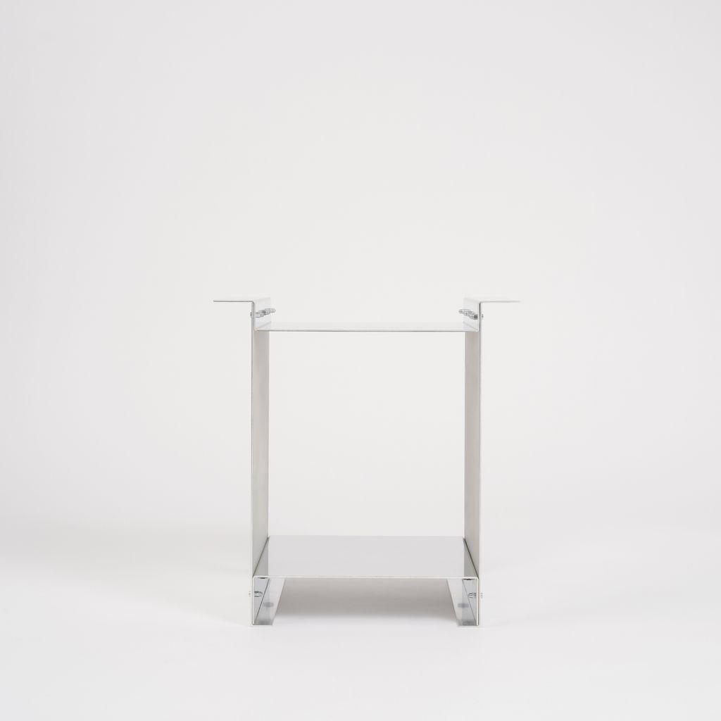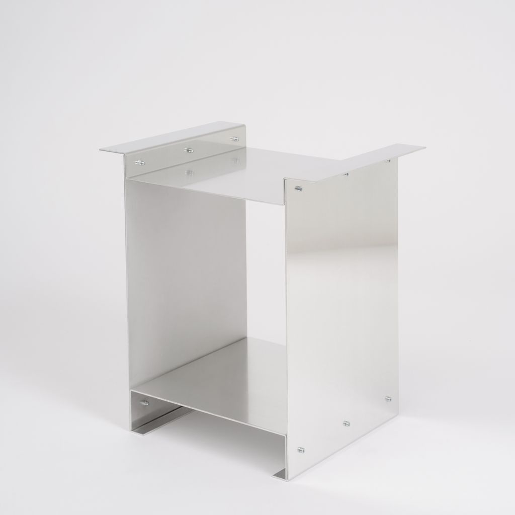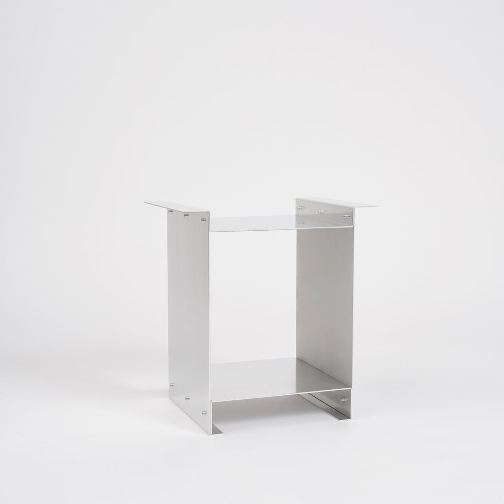 The Side Table is the first piece of the winged series. It is made from standard, industrially folded aluminium profiles, which are joined to become a small table by visible stainless steel nuts and bolts.