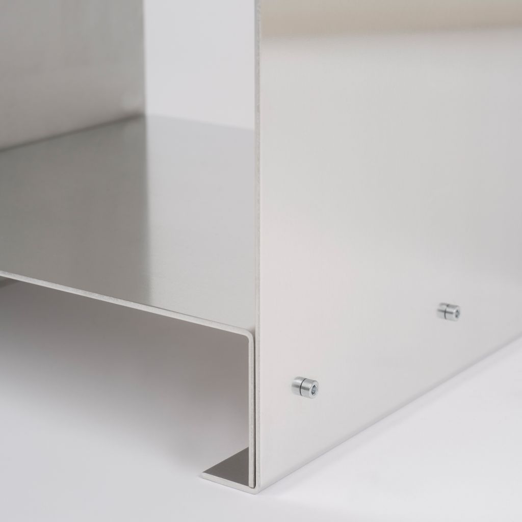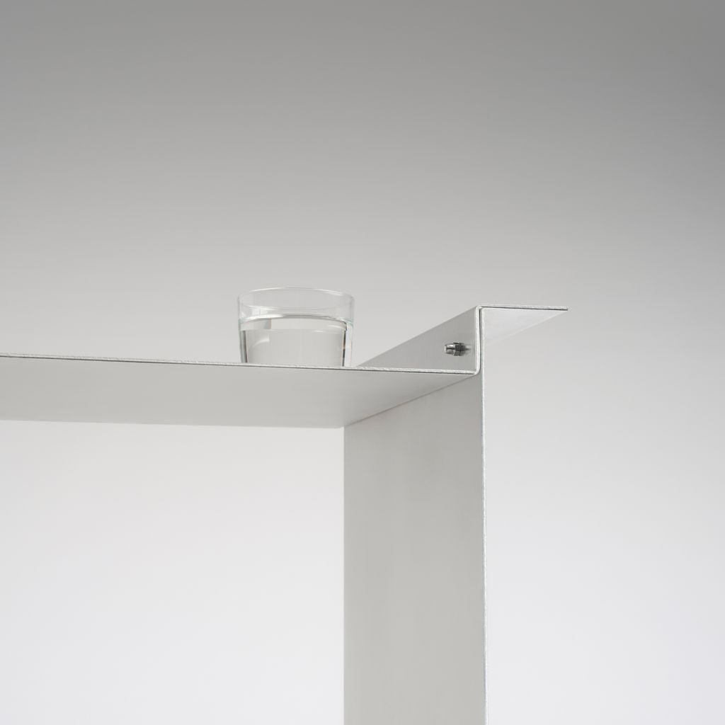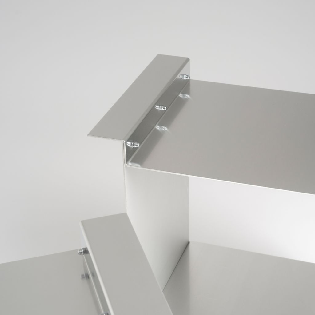 The whole piece relies on a system of framing and resting elements, where one piece depends on the other. The folded aluminium sheets are blank and shiny from the outside and matt hand brushed from inside. All edges and corners are carefully chamfered by hand