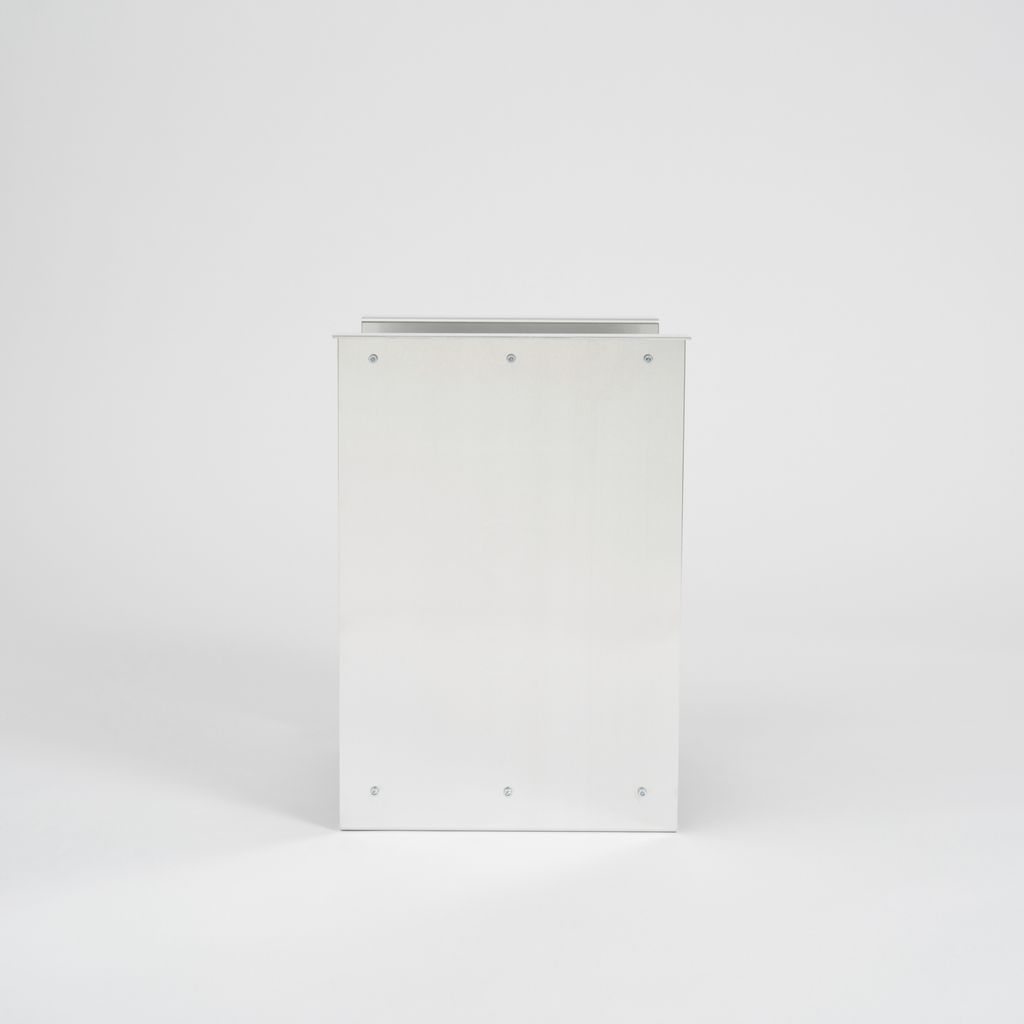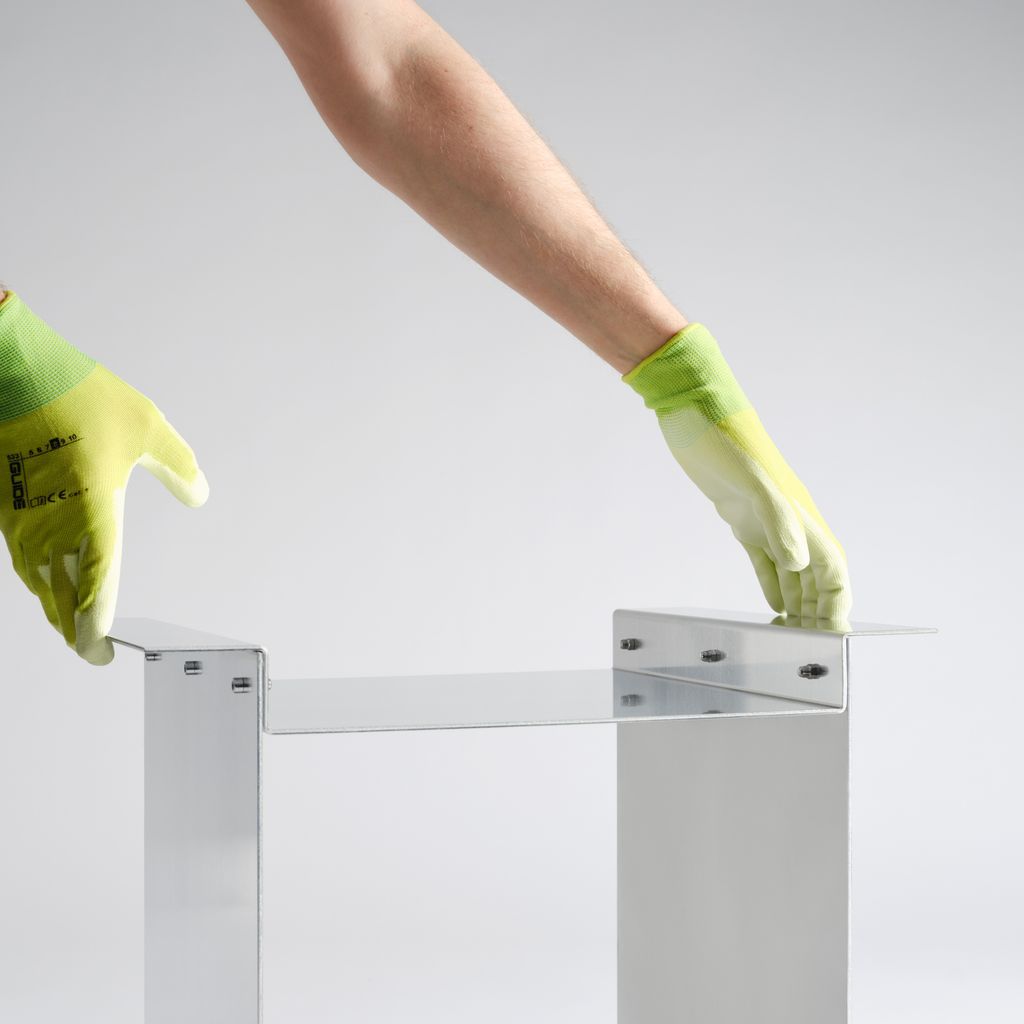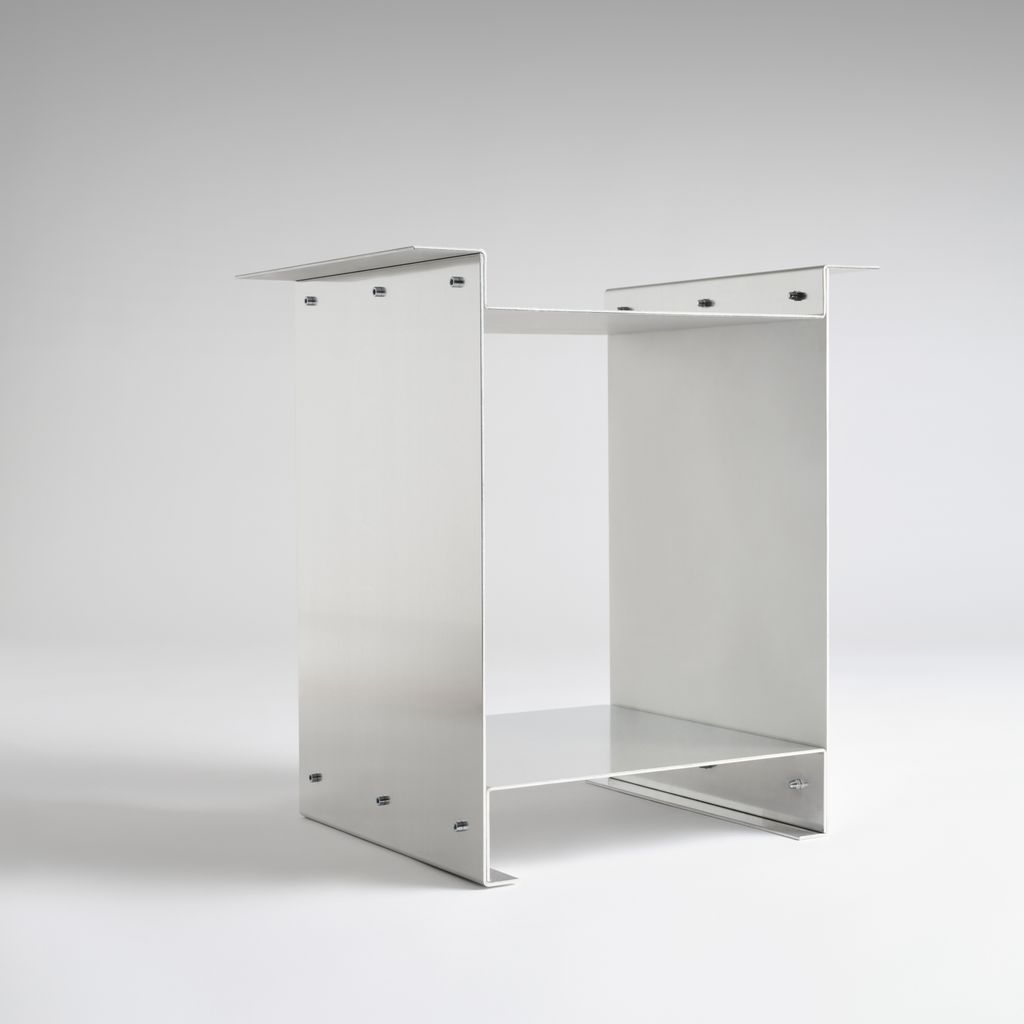 The whole piece relies on a system of framing and resting elements, where one piece depends on the other. The folded aluminium sheets are blank and shiny from the outside and matt hand brushed from inside. All edges and corners are carefully chamfered by hand